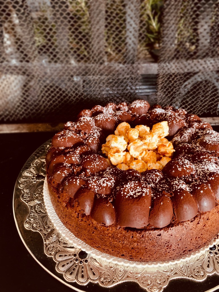 La copertura di cioccolato e dei popcorn caramellati completano questo dolce golosissimo