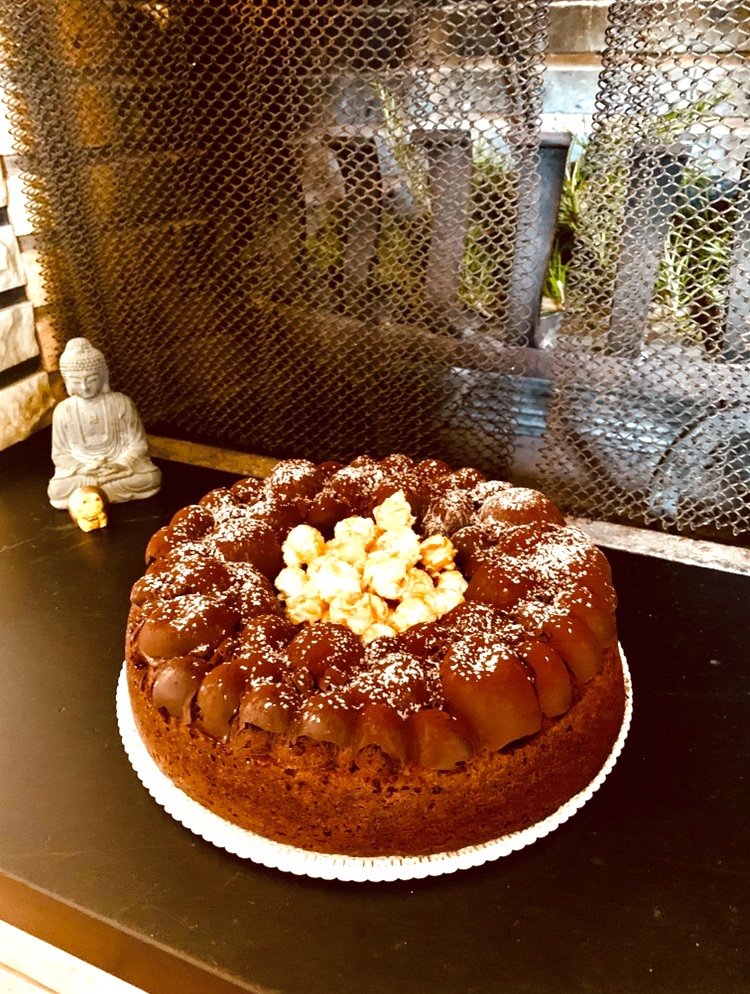 Smodellare la torta e completare la decorazione con una manciata di popcorn caramellati nel buco centrale.