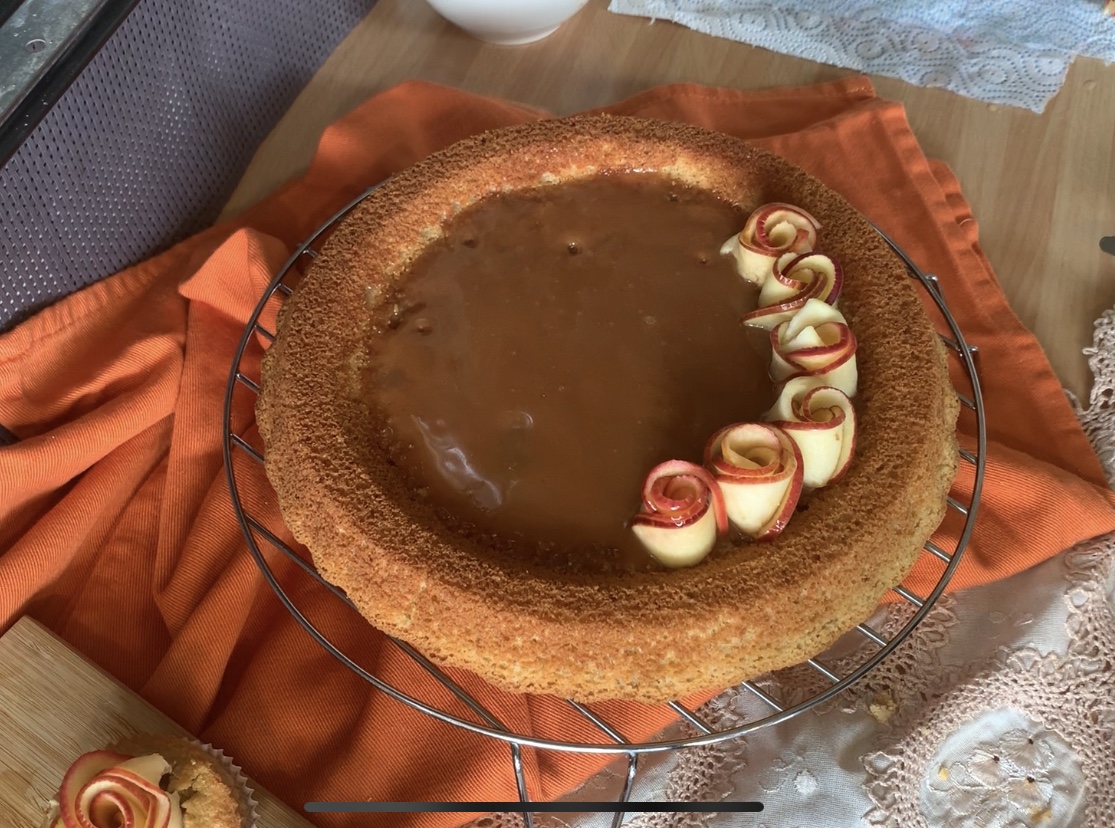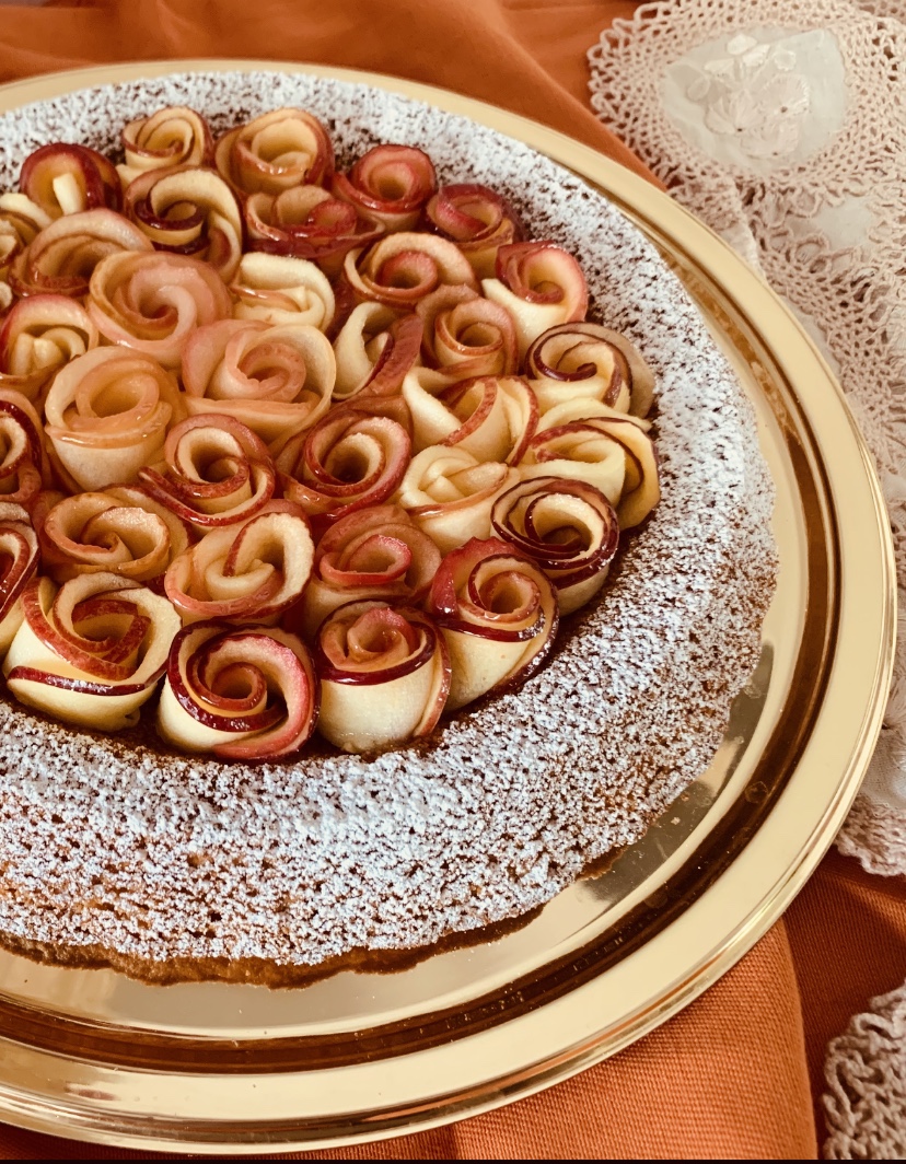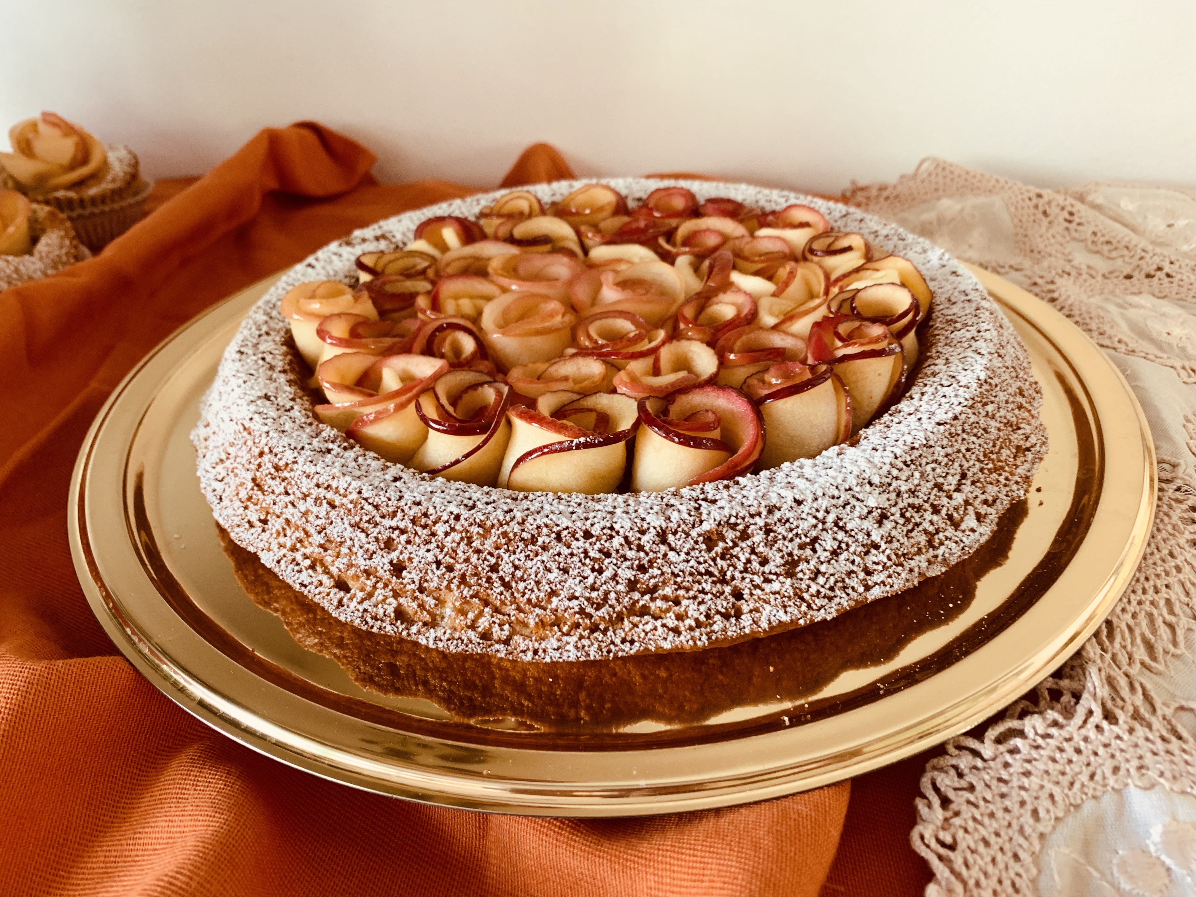 Lasciata raffreddare la torta a temperatura ambiente l’ho poi farcita nell’incavo, lasciato dalla forma furba, con del caramello al burro salato, ma puoi usare della composta di mele o della crema pasticciera, e coperto con delle roselline di mele formate con fettine sottili e ammorbidite per 20 minuti in uno sciroppo di acqua, zucchero e limone fatto bollire precedentemente.