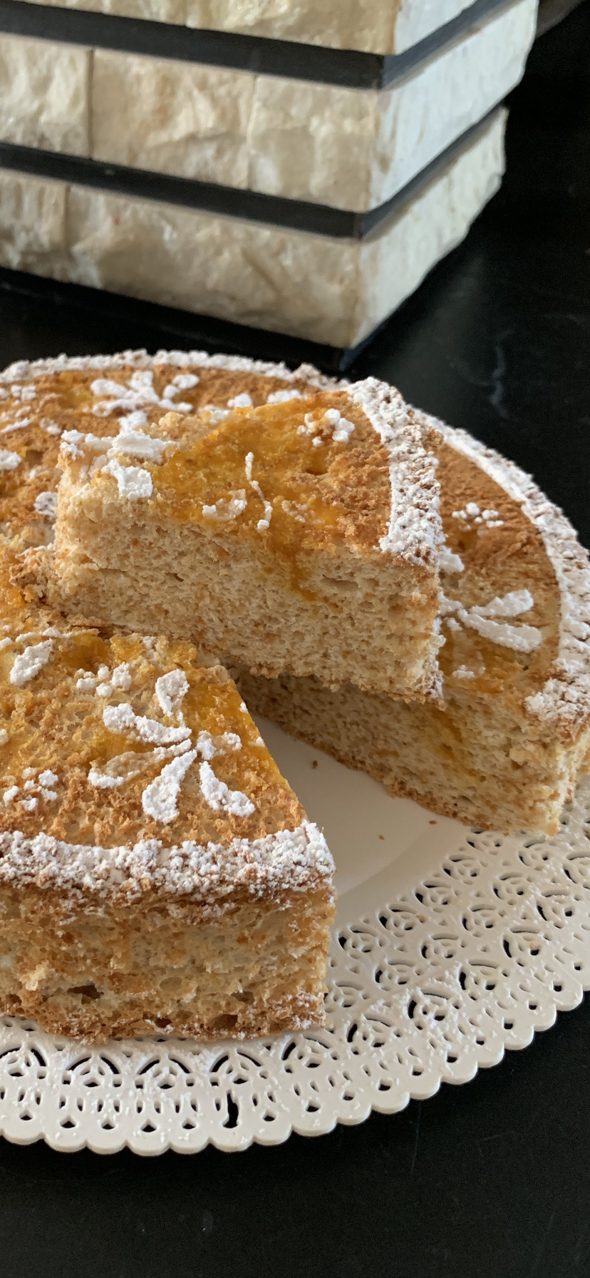 Servire l’Angel Cake all’avena e Colomba spolverandolo con dello zucchero a velo, da sola o accompagnata con una crema o confettura a piacere, io la mia confettura di carote e arance.