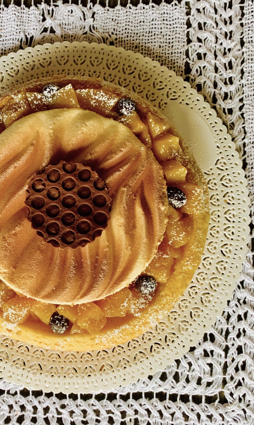 Ho svuotato la circonferenza della torta con un incavo di circa 3 cm, lasciando il centro dove ho adagiato sopra un disco di crema pasticciera che avevo preparato usando una forma di silicone che ho congelato e poi spruzzato con del cacao spry, ma si può tranquillamente usare della crema a cucchiaiate o usando un sac a poche.