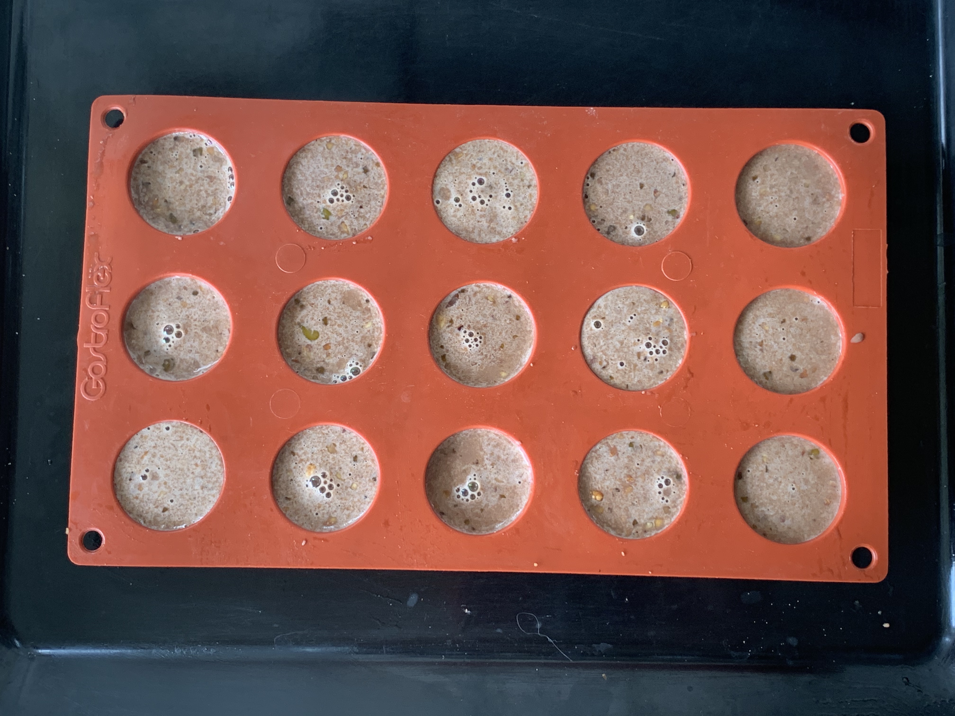 Versare il preparato in formine di silicone da 3 cm di diametro e cuocere a bagnomaria per circa 30 minuti a 150 gradi.