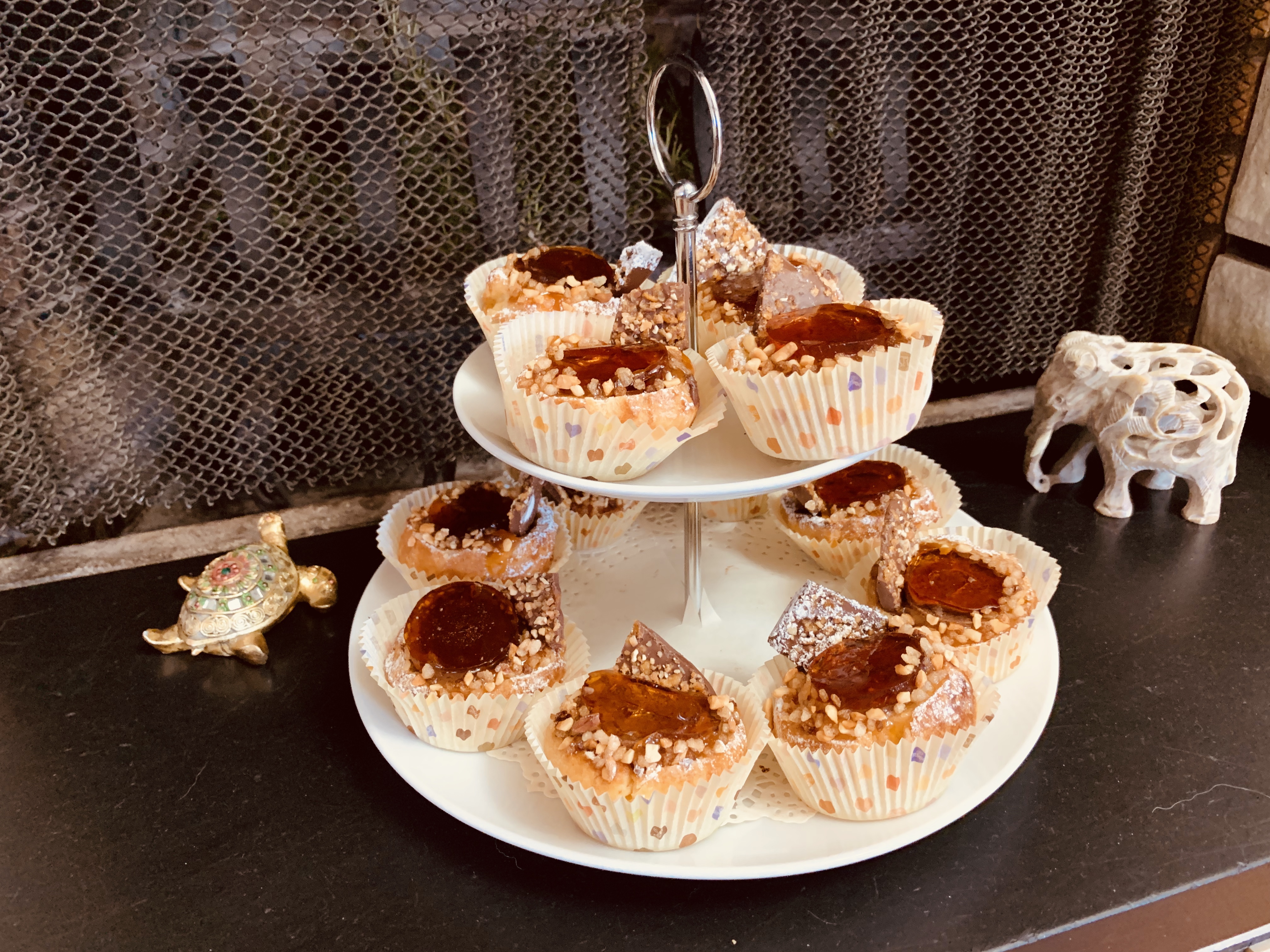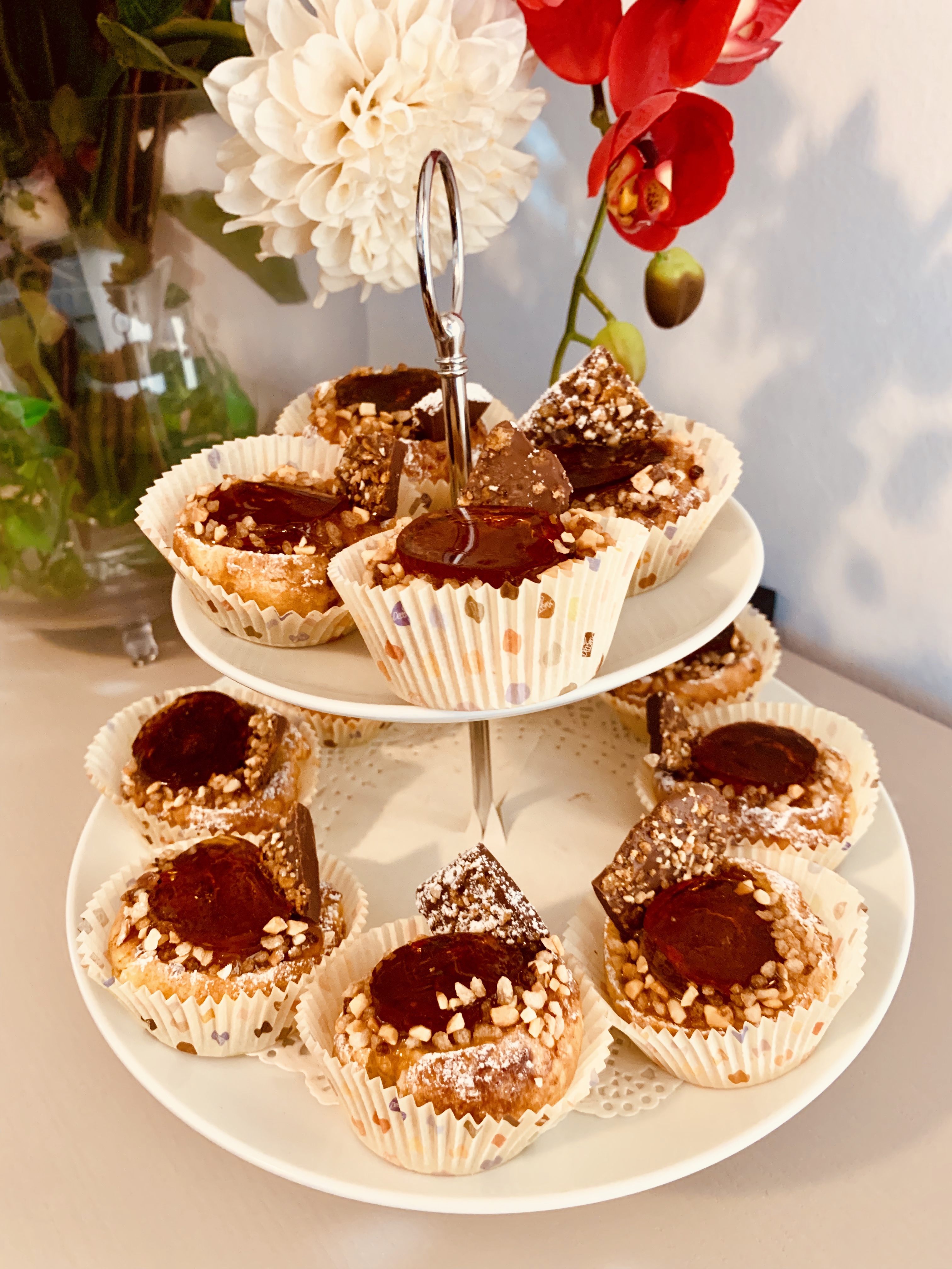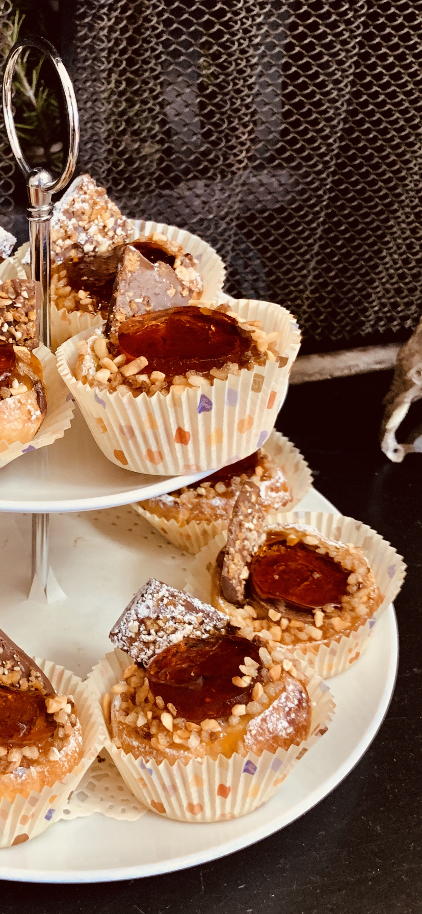 Per finalizzare il Bignè Bonet, l’ho decorato con un pezzetto di cioccolato, coperto il contorno con della granella di nocciole e una spolverata di zucchero a velo.