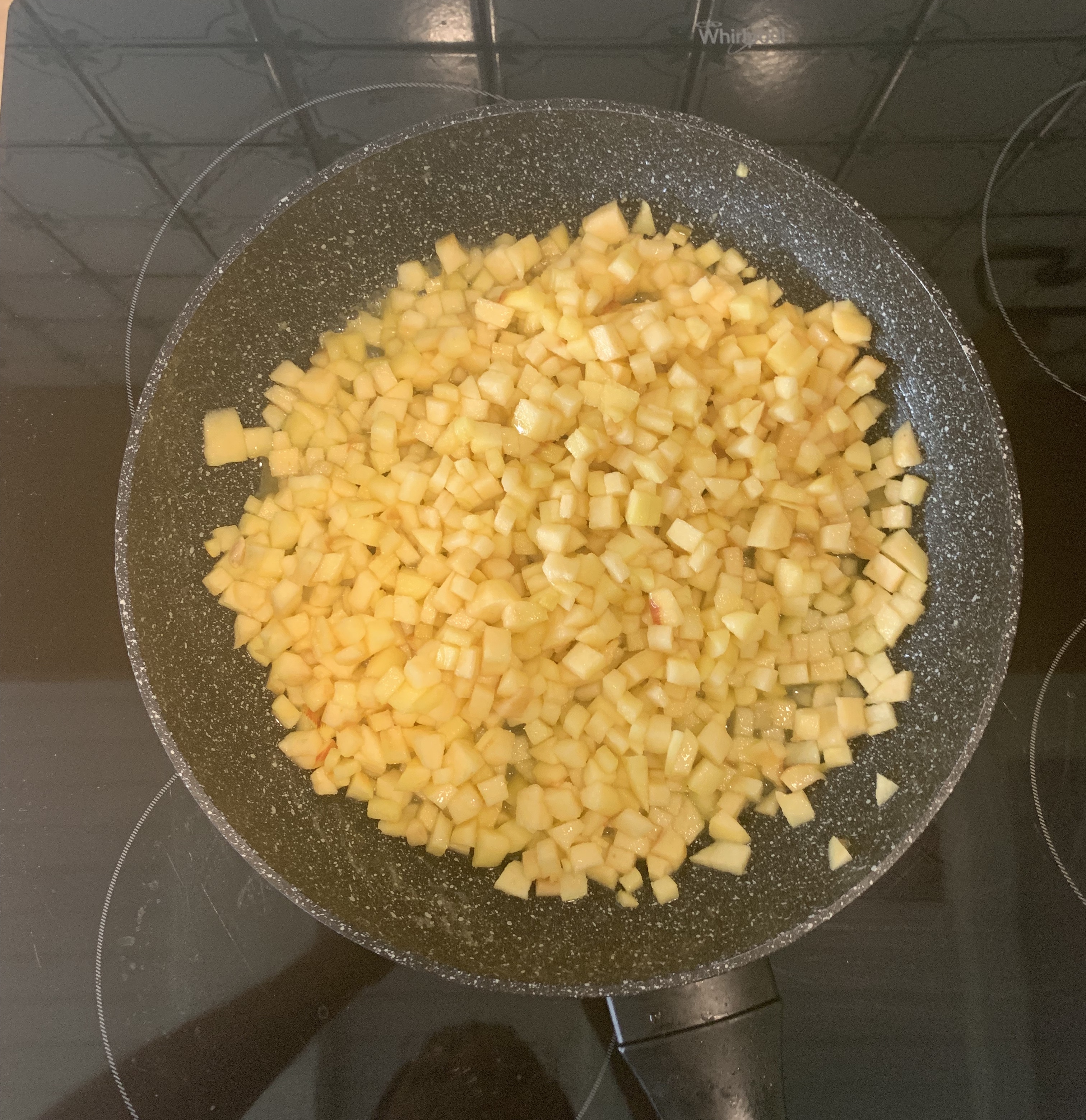 Iniziamo con lo sbucciare le mele e tagliarle a cubettini piccolissimi, poi sciogliere il burro e il miele in una padella prima di aggiungere le mele. L’obiettivo è cucinarle appena il necessario, quando saranno tenere, circa 5 minuti, spegnere il fuoco.