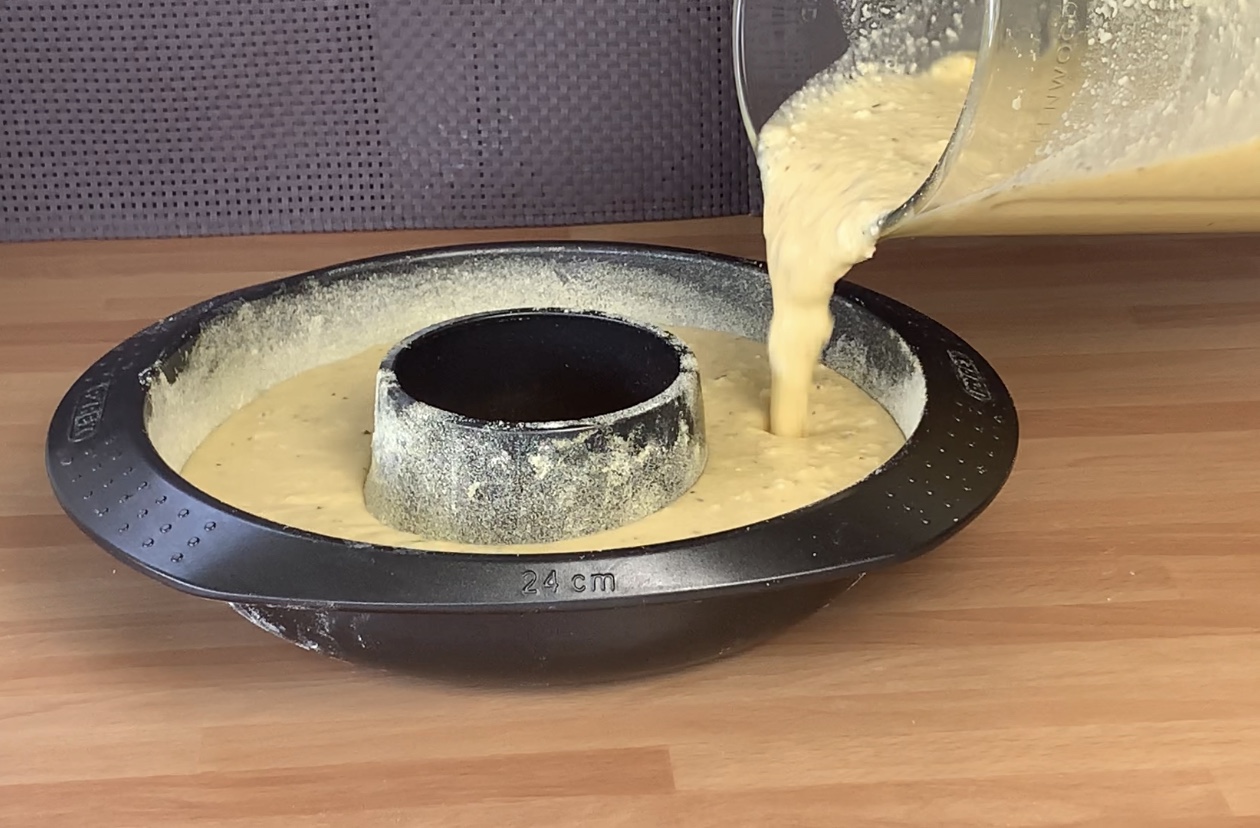 In questa ricetta sto usando una forma rotonda con un buco nel mezzo con 26 cm di diametro e 8 cm di profondità.