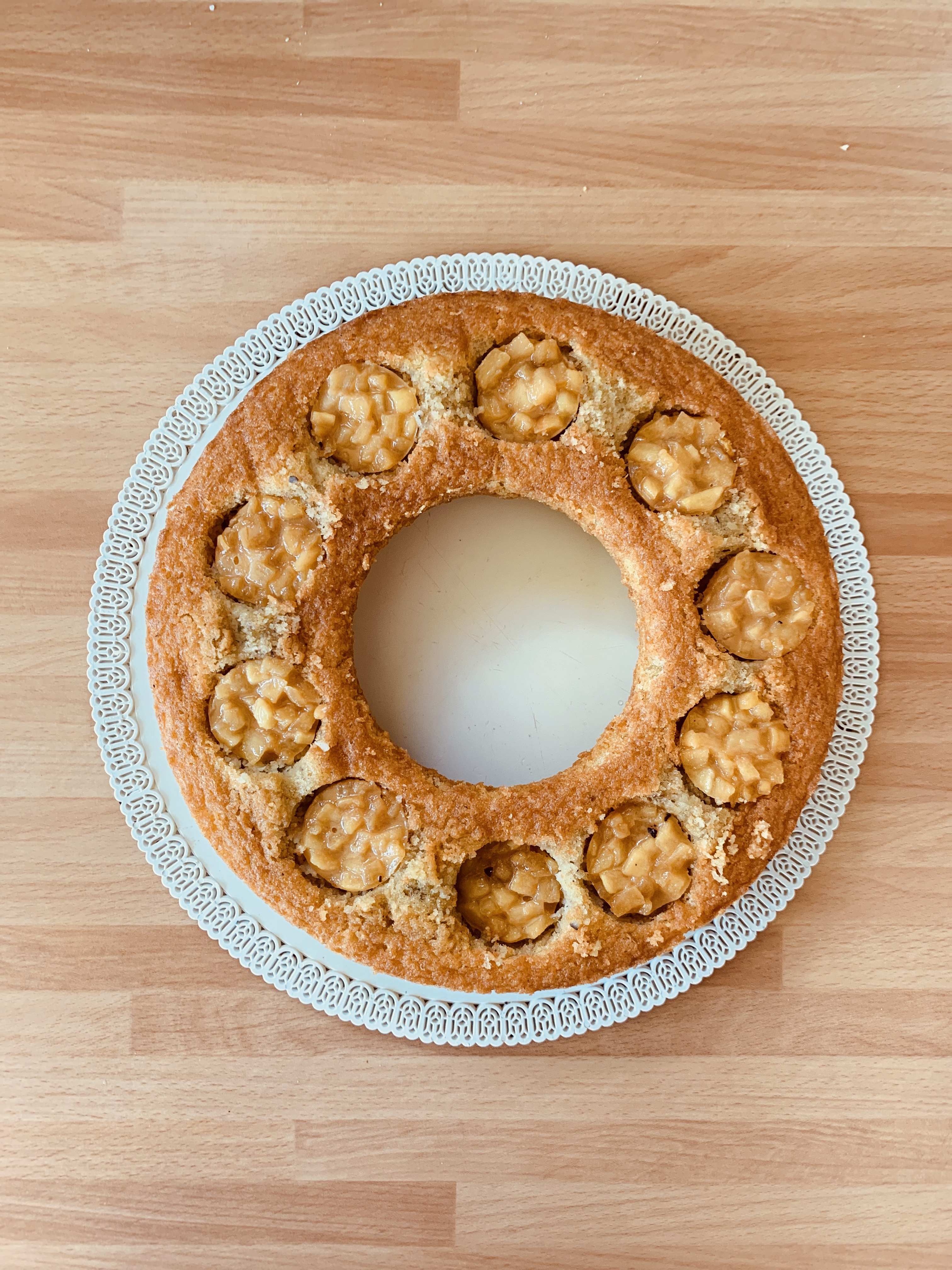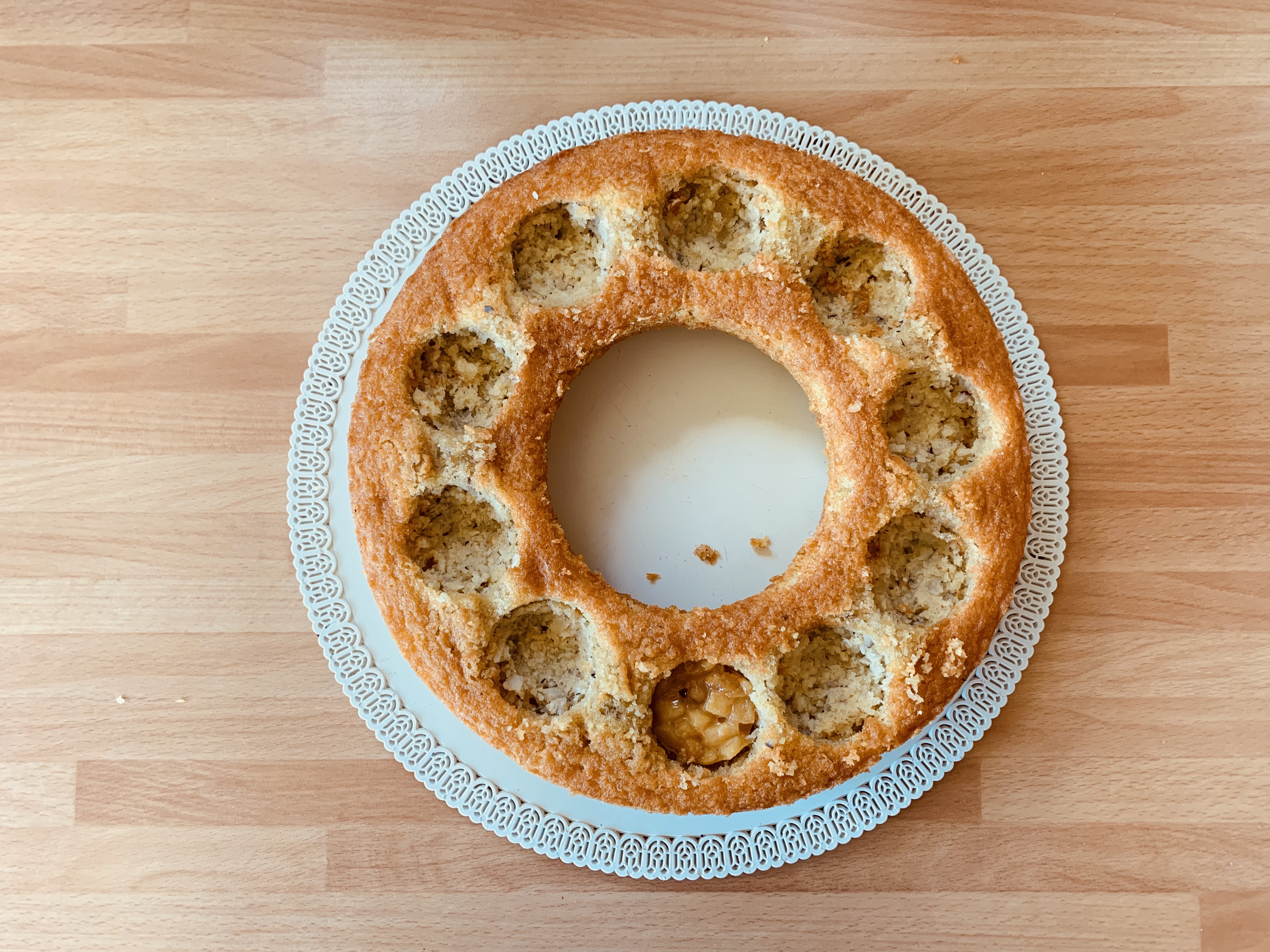 Ho capovolto la ciambella e con un piccolo coppa pasta da 3 cm ho creato dei fori dove verranno inseriti i cubetti di mela caramellata.