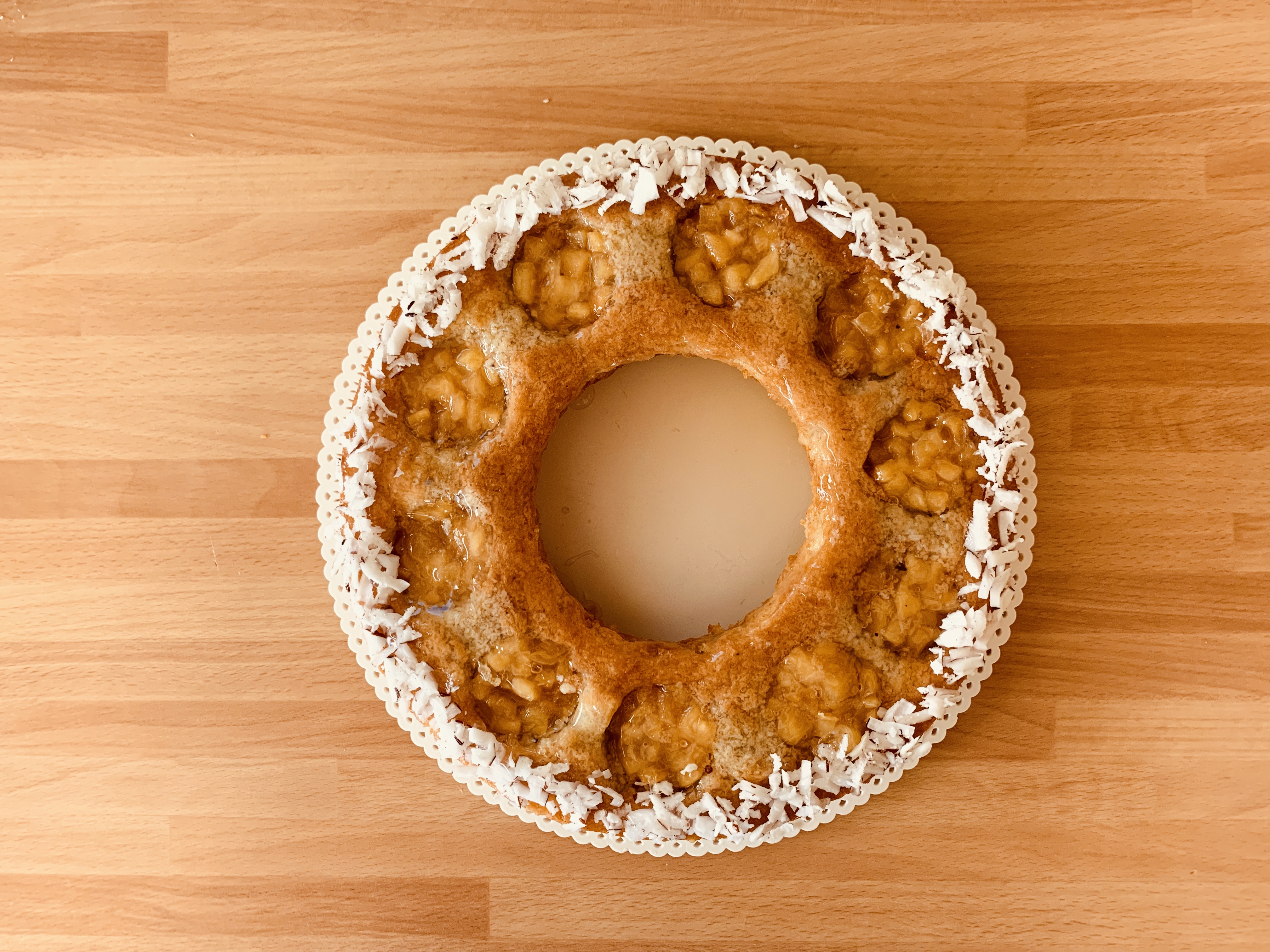 Ho poi spennellato la ciambella intera con gelatina neutra e coperto i bordi con del cocco fresco grattugiato.