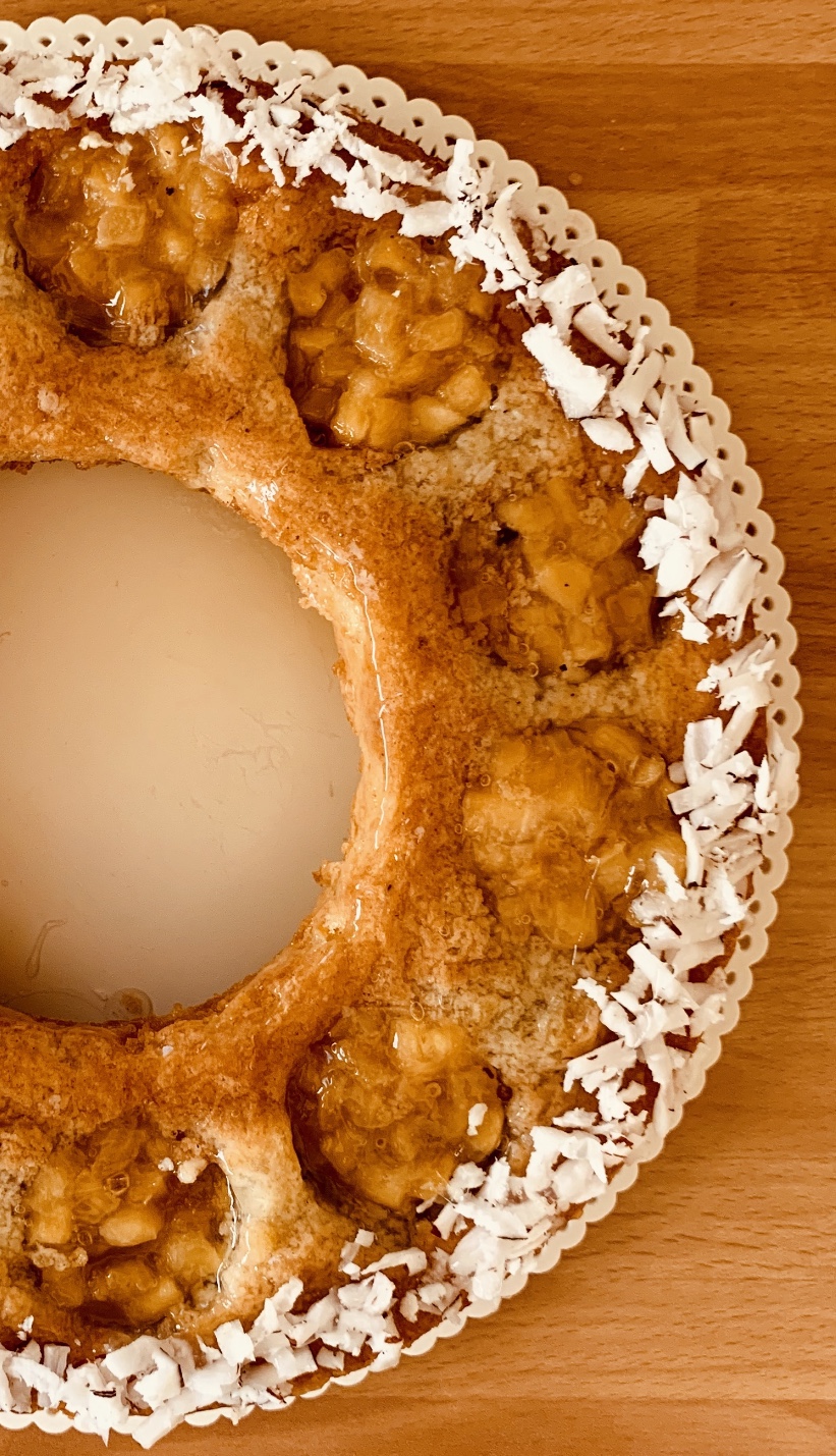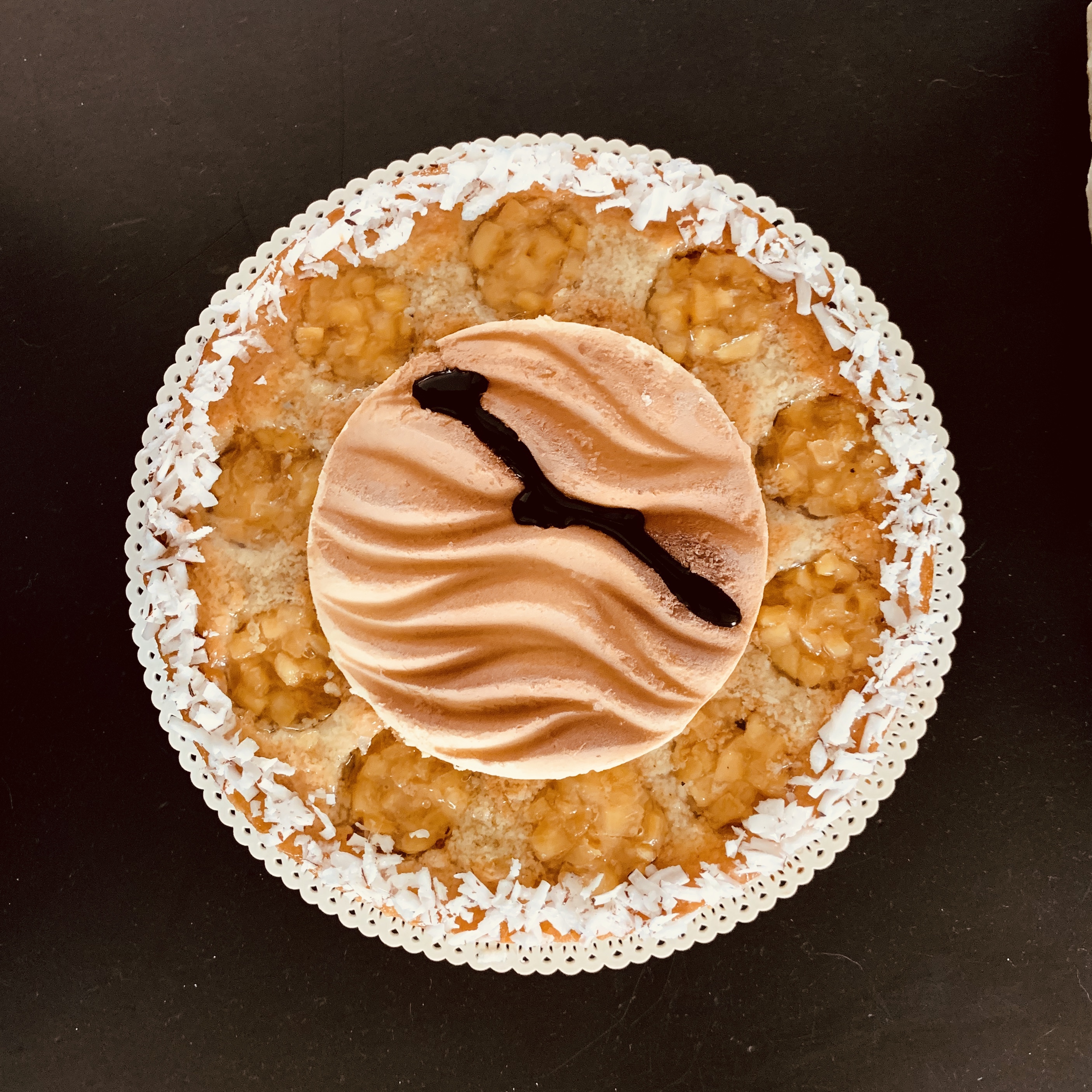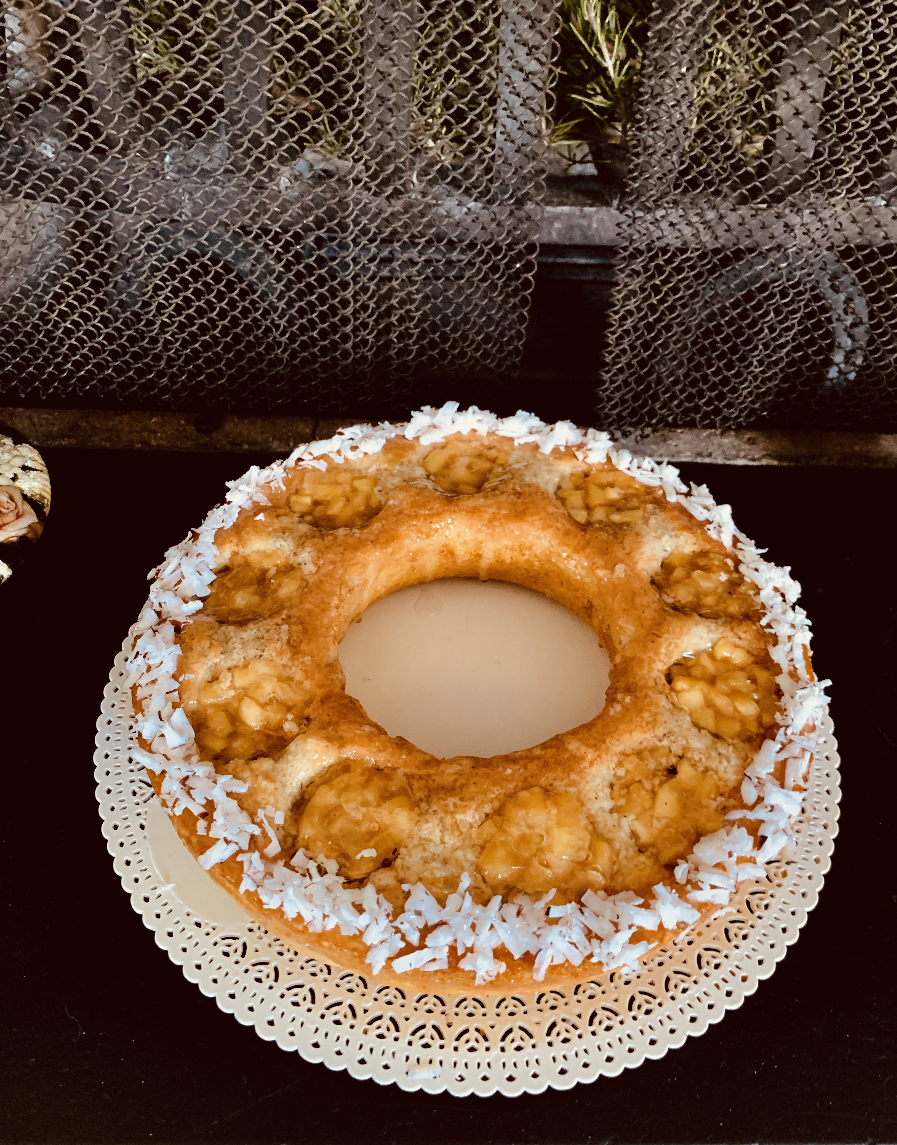 Per finire ho voluto esagerare, avevo conservato in frizer, in una particolare forma di silicone decorativa della Pavoni, della crema pasticciera che ho spruzzato con della cacao liquido e appoggiato al centro della ciambella trasformandola in una golosissima Torta Cocco, Mais, Mele e Crema Pasticciera. 😋