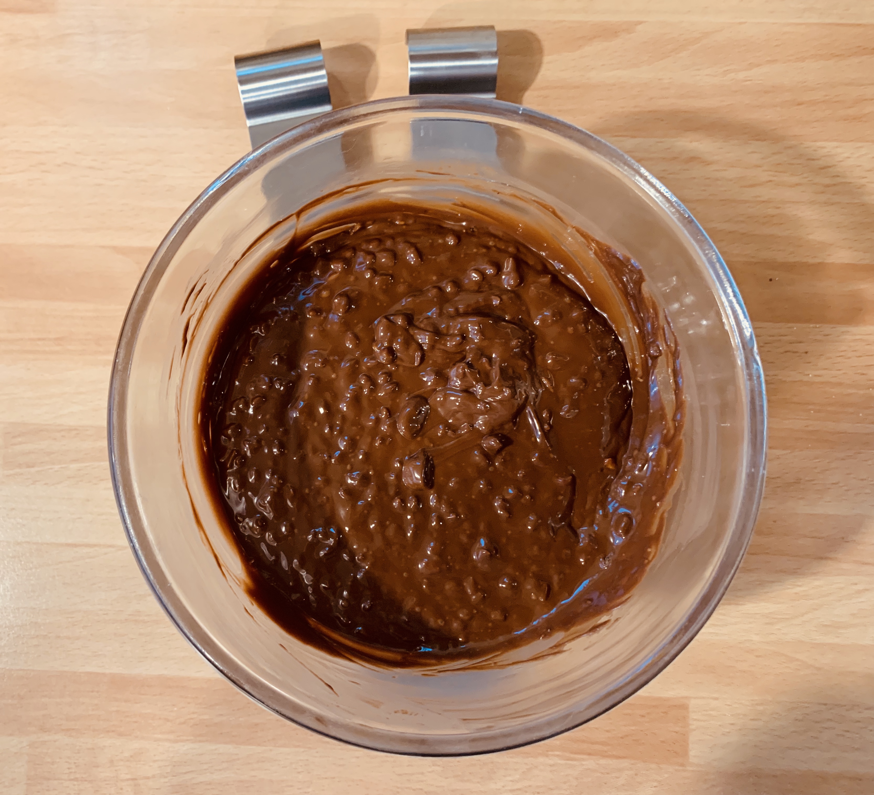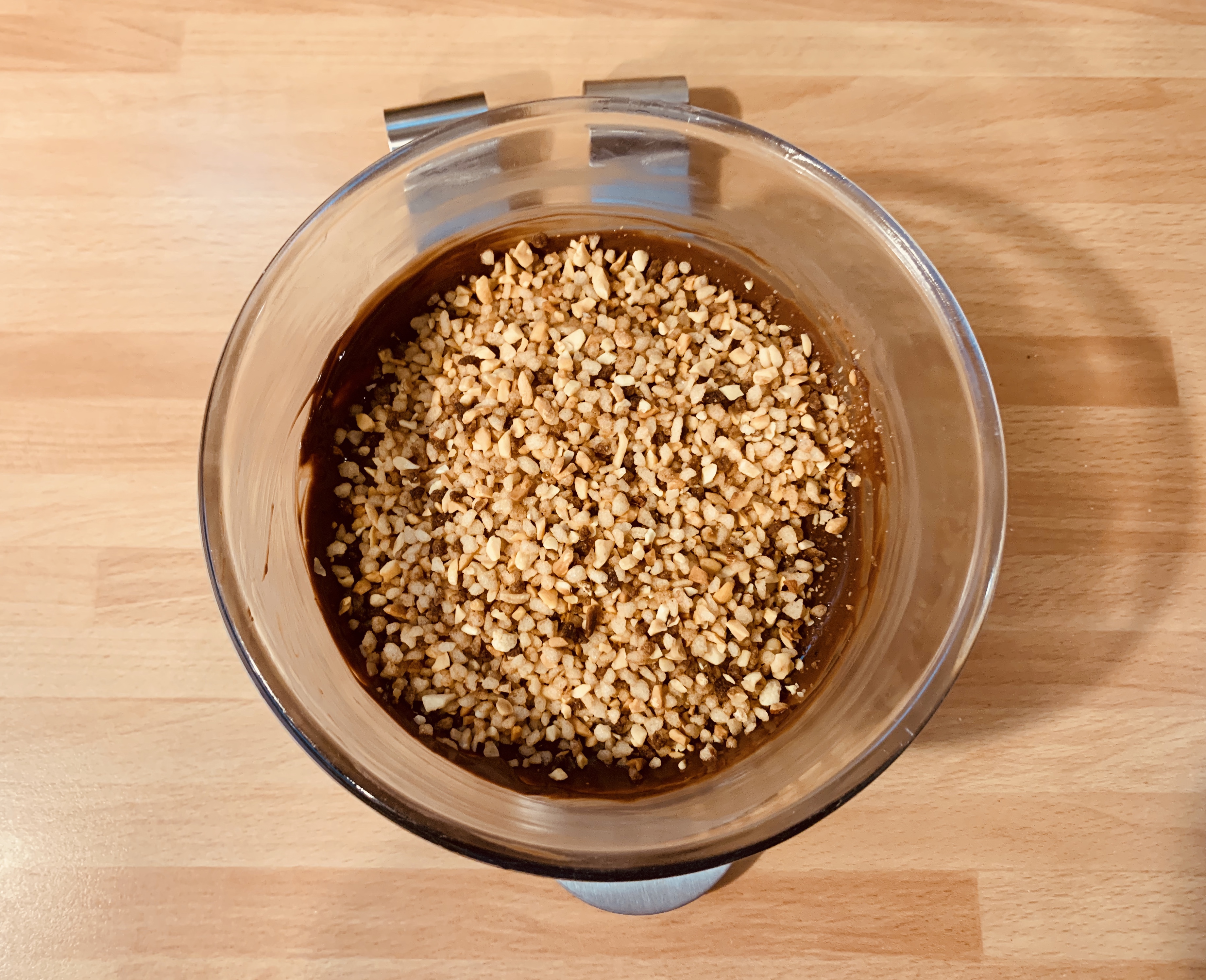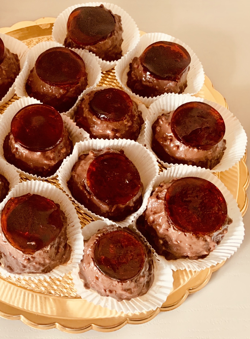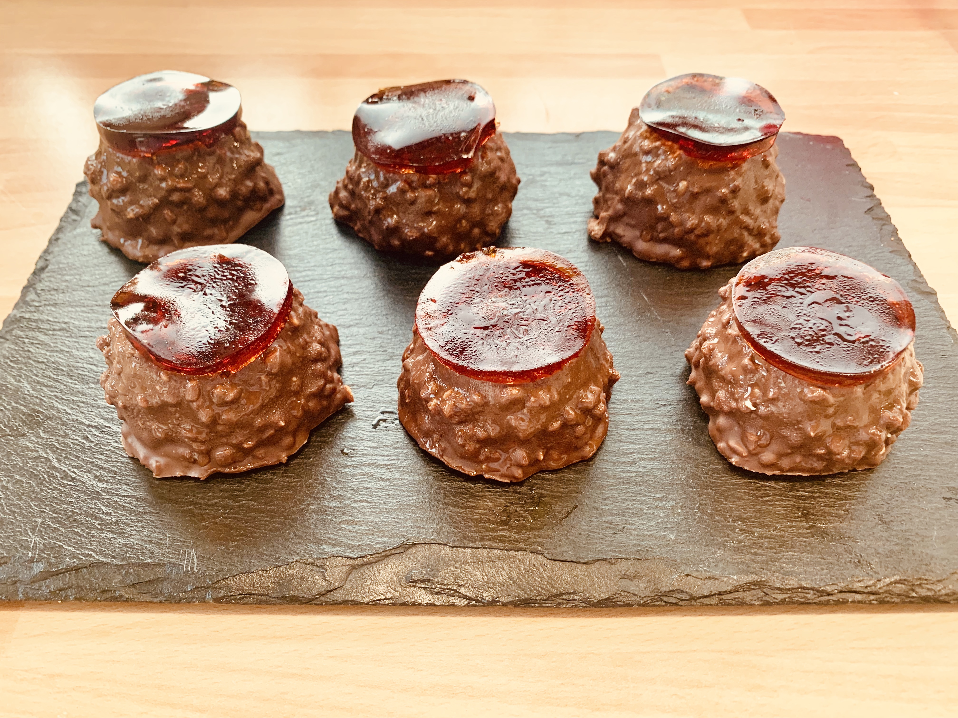 Sciogliere il cioccolato al microonde, aggiungere il burro fuso e infine la granella di nocciole, lasciare intiepidire poi immergere i Bonet congelati per glassarli usando uno stecco di legno evitando di coprire la parte superiore dove verrà adagiato un dischetto di gelatina di caramello.