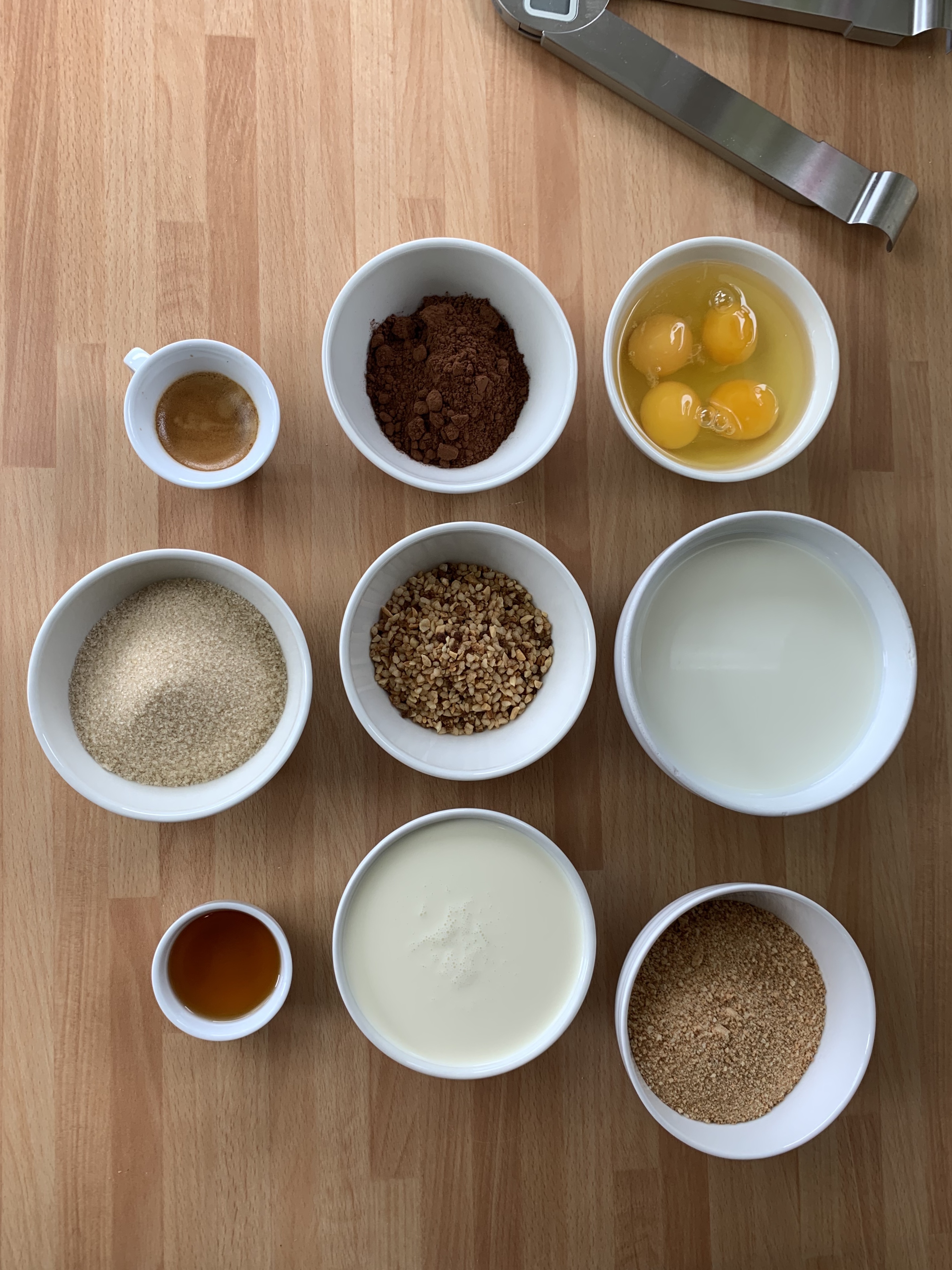 In una ciotola amalgamare in sequenza le uova, lo zucchero, la granella di mandorle, il cacao, il caffè, l’amaretto e la granella di nocciole.