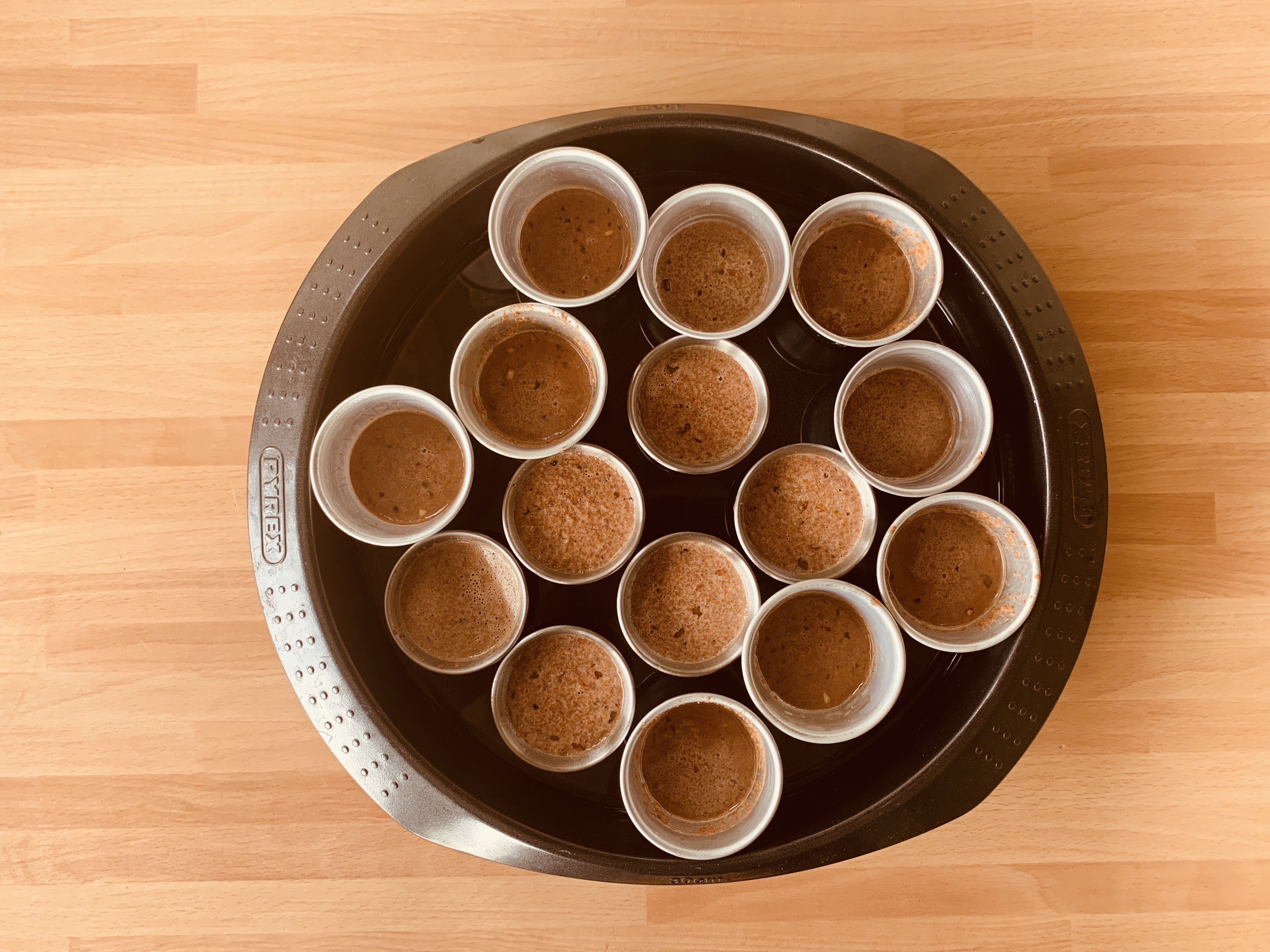 Versare il preparato nelle formine da budino per 2/3 e cuocere a bagnomaria per circa 30 minuti a 150 gradi.