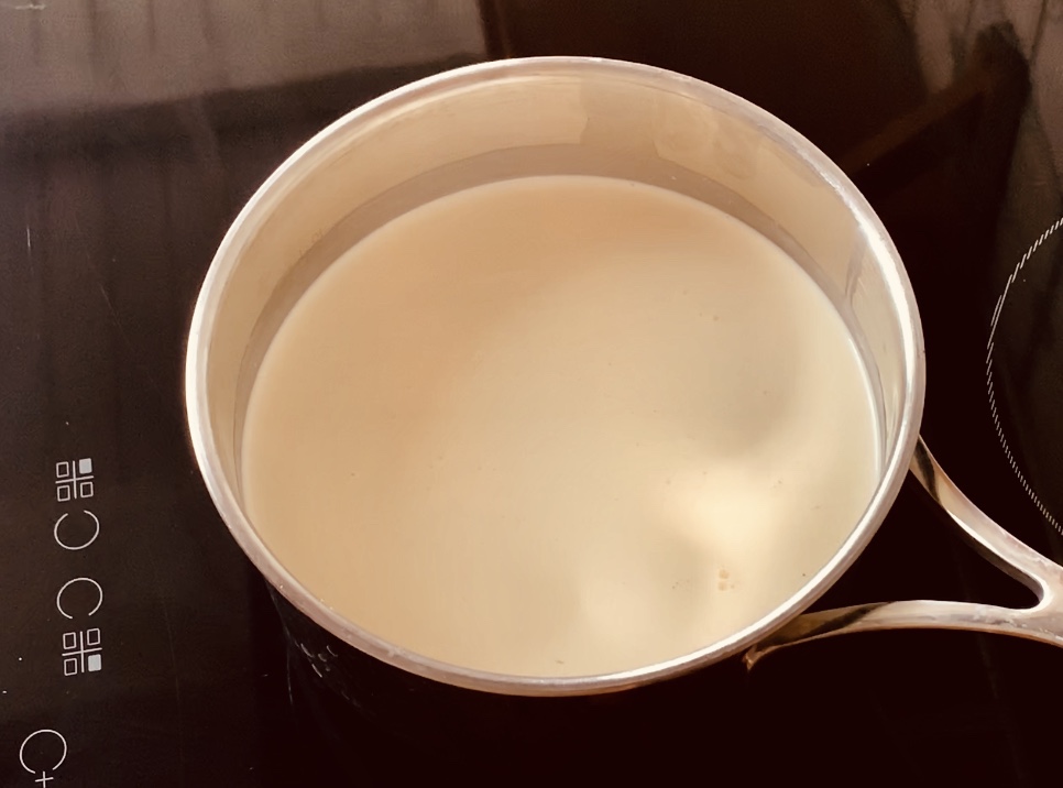 Portare ad ebollizione latte e panna e versarli sul composto del Bonet, usando la frusta amalgamare tutti gli ingredienti alla fine rimuovere con un cucchiaio la schiuma creatasi per evitare bolle in cottura.