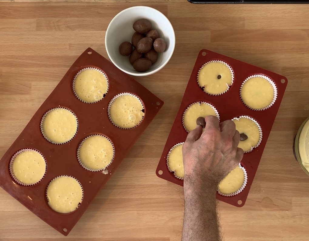 Versare il composto in 24 stampini di muffin da 4 cm, inserire un pezzetto di cioccolato al centro ad alcuni e cuocere in forno statico a 180 gradi per per circa 30 minuti