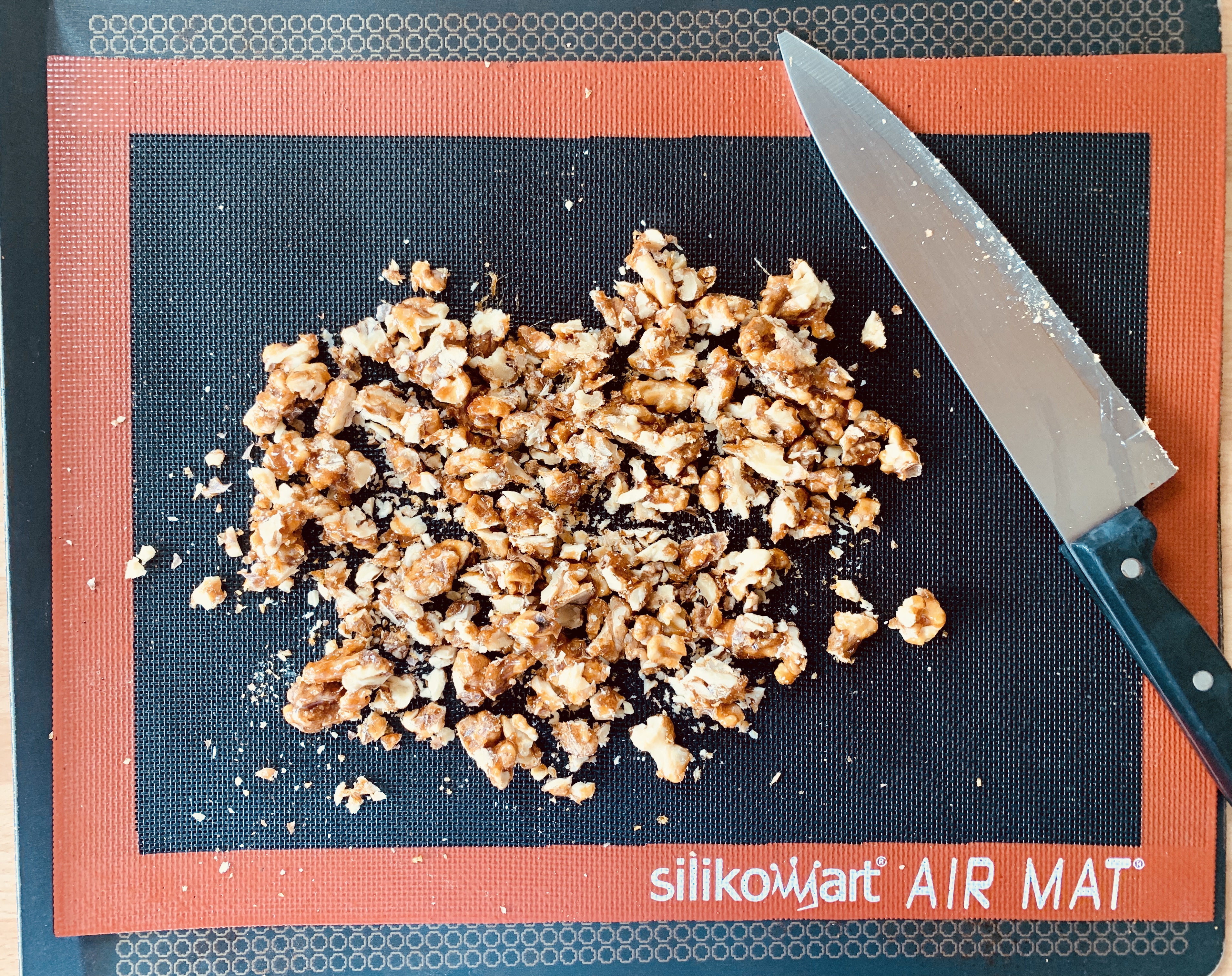 Lasciare per un altro minuto a fuoco medio e quindi trasferirle su un tappetino di silpat o carta forno e lasciare raffreddare completamente e poi tritare a pezzetti più piccoli con un grosso coltello.