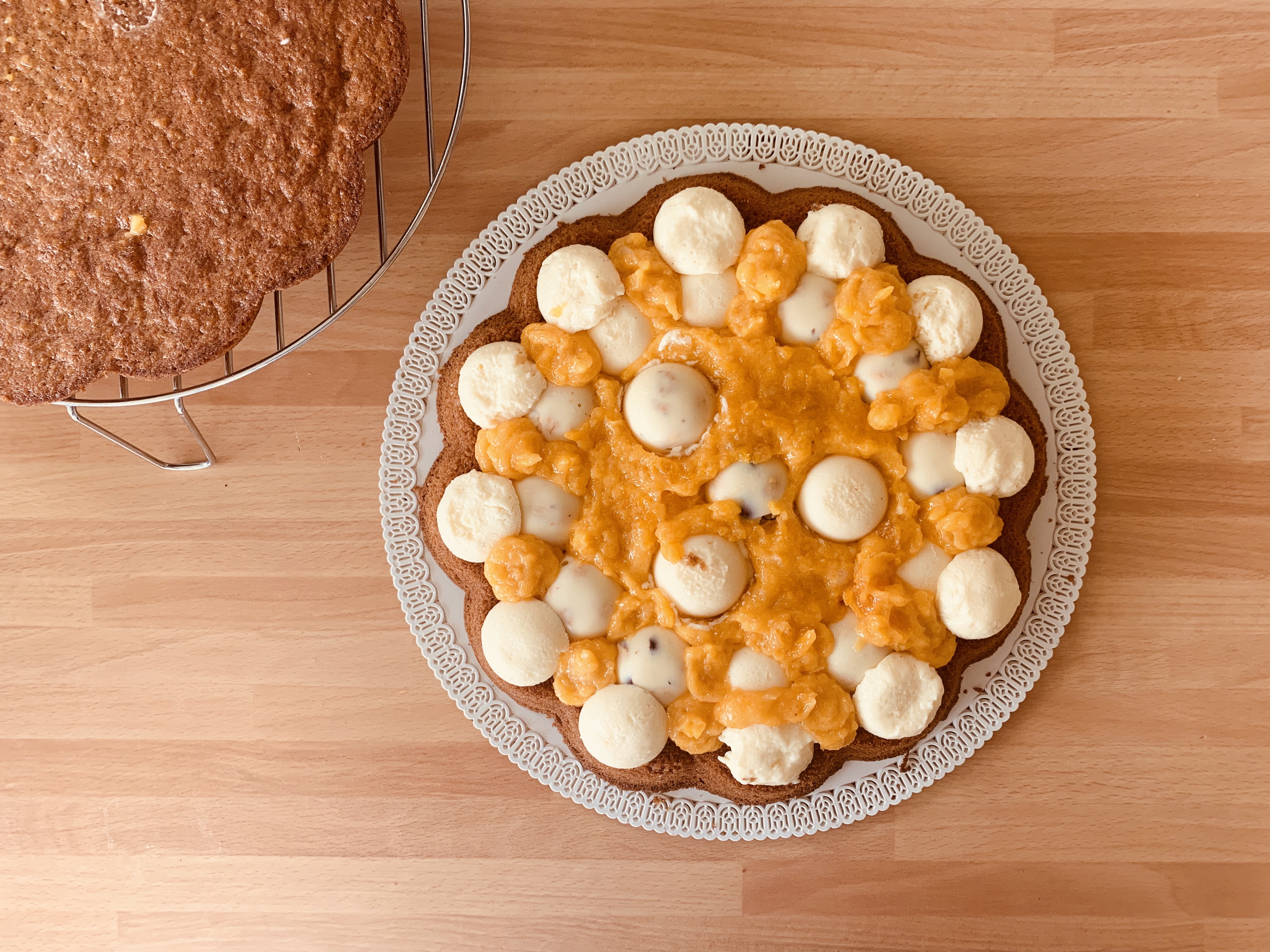 Mettere il primo disco di torta sul piatto di portata e coprirla con ciuffi di crema chiboust lungo la circonferenza, al centro spalmare la crema alle albicocche e qualche ciuffo di crema chiboust, per finire incastrare qualche pezzetto di noce caramellata