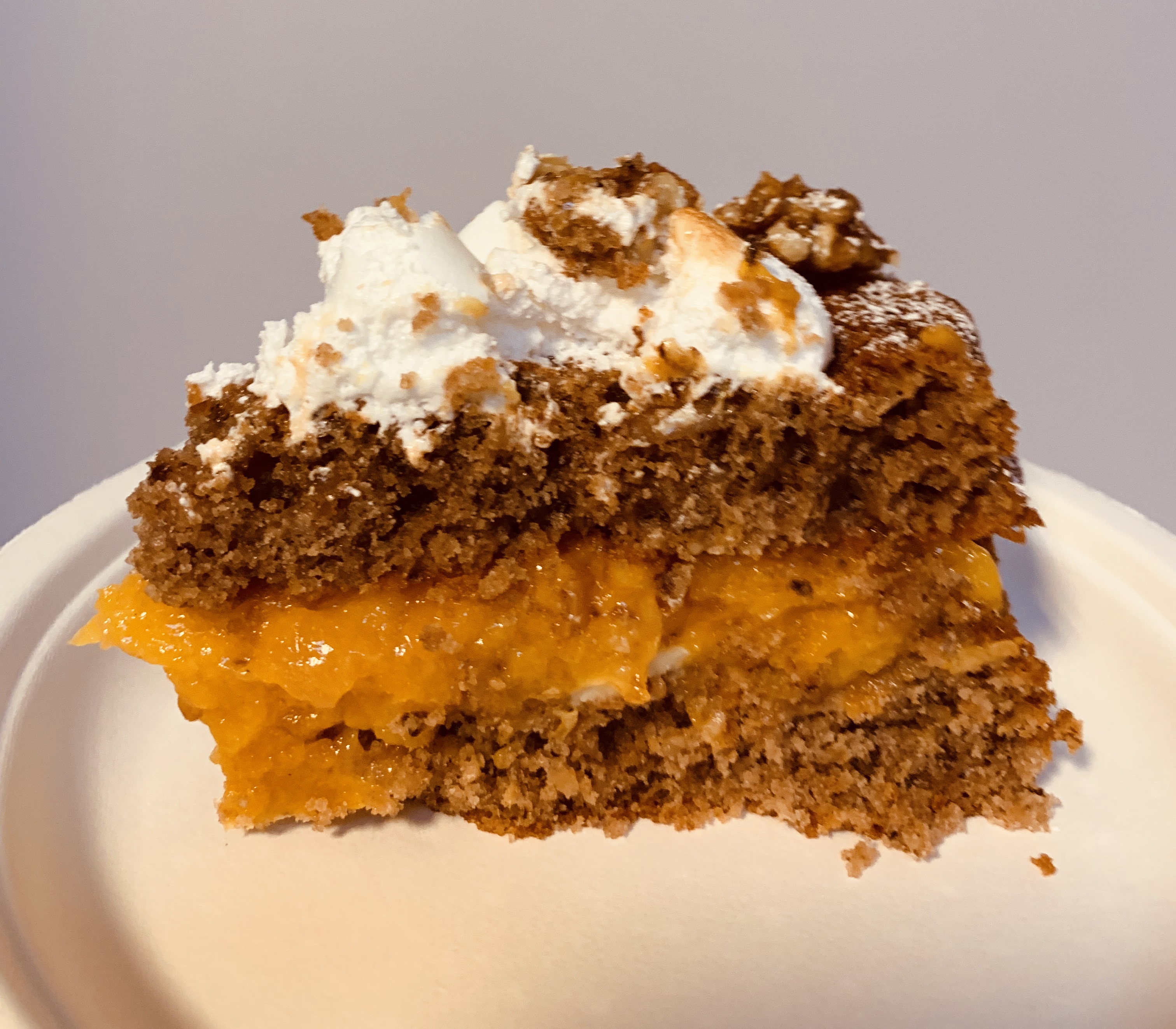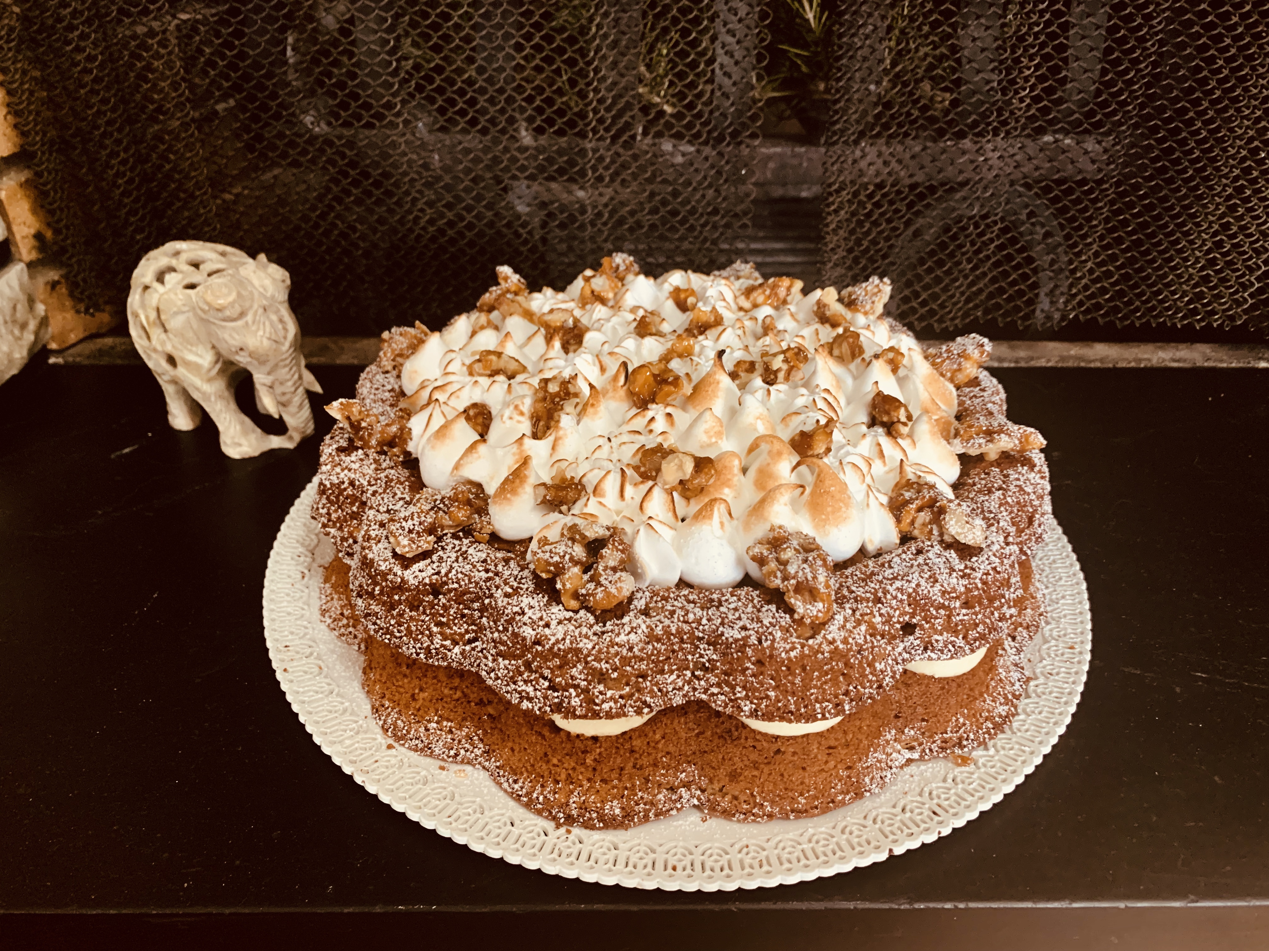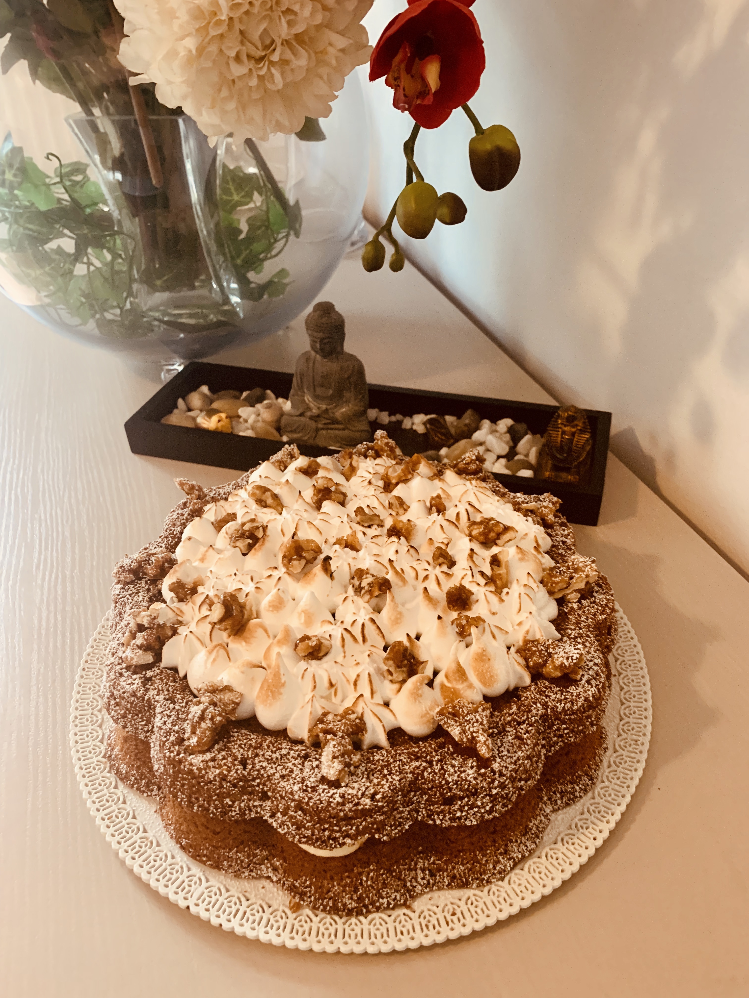 Le noci sono l’ingrediente principale, le troviamo nell’impasto e caramellate come decorazione, una crema al latte di mandorle o più correttamente bevanda di mandorle, all quale ho unito una meringa italiana trasformandola in Crema Chiboust e una crema di albicocche disidratate completano questa Torta spettacolare, ricca di fibre e vitamine.