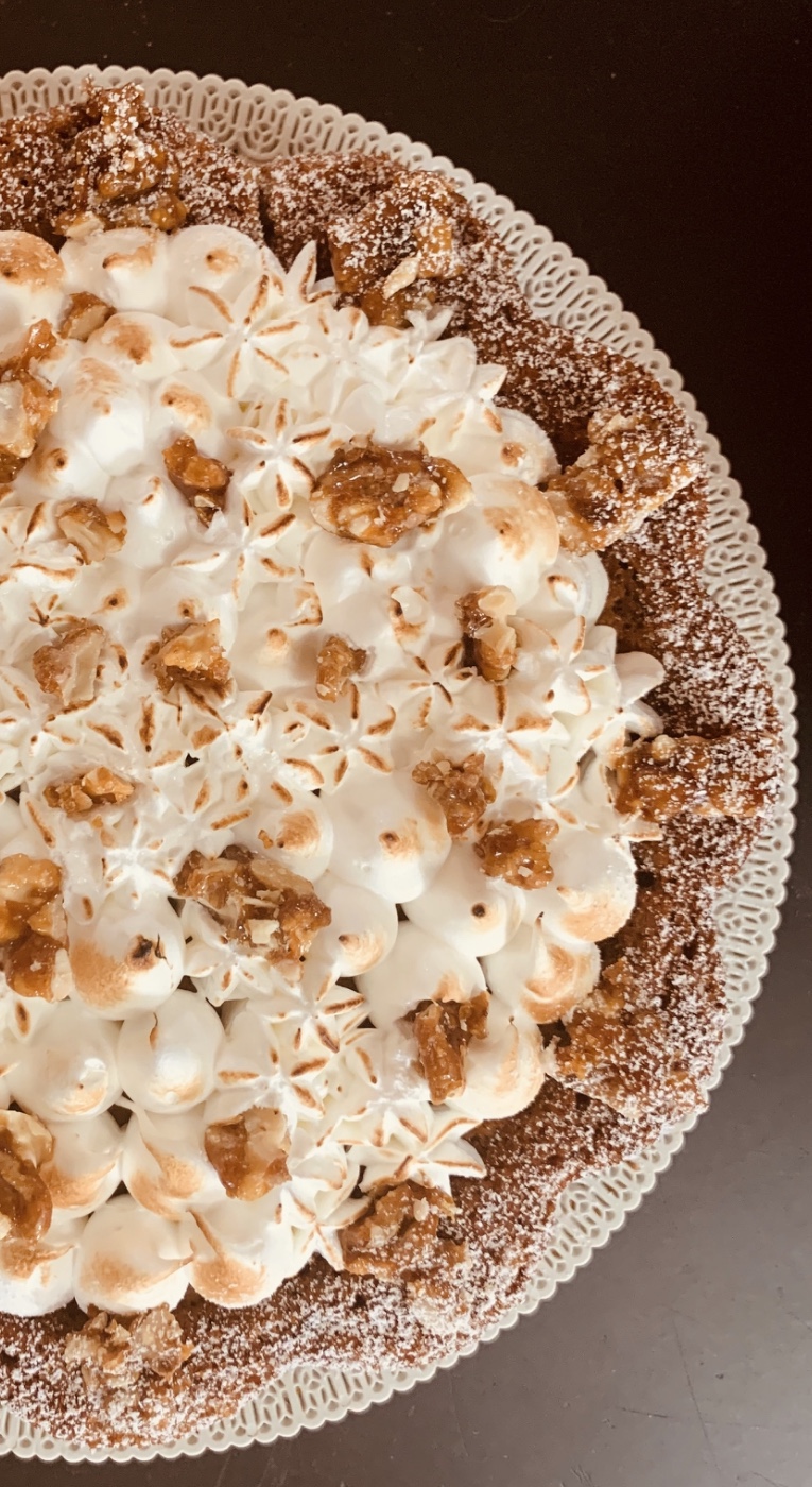 fiammeggiarla con il cannello, incastrare tra un ciuffo e l’altro qualche pezzo di noce caramellata e finalizzarla con una spolverata di zucchero a velo sui bordi.