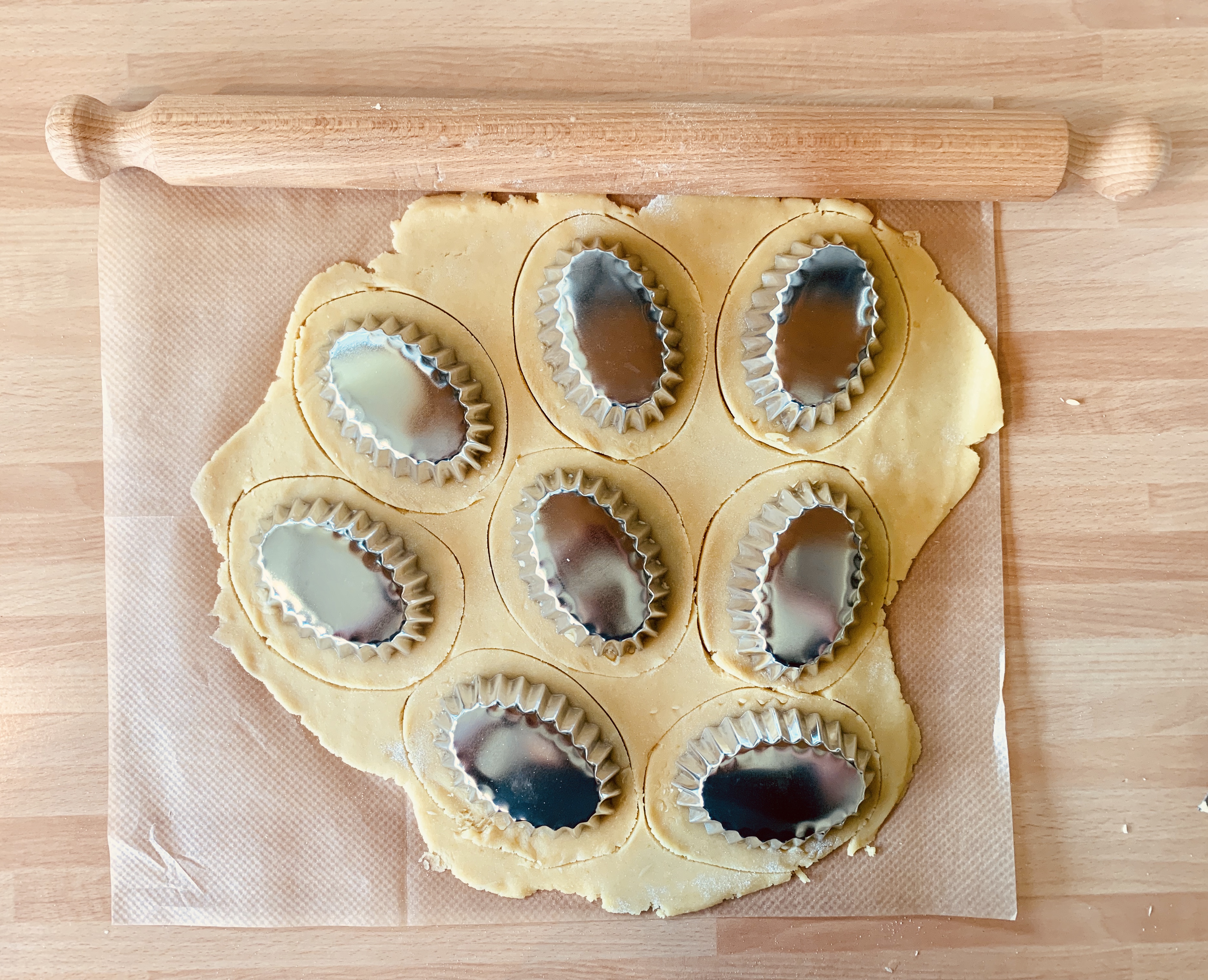 Stesa la frolla a circa 3 millimetri creare con un coltellino un ovale intorno alla forma del pasticciotto