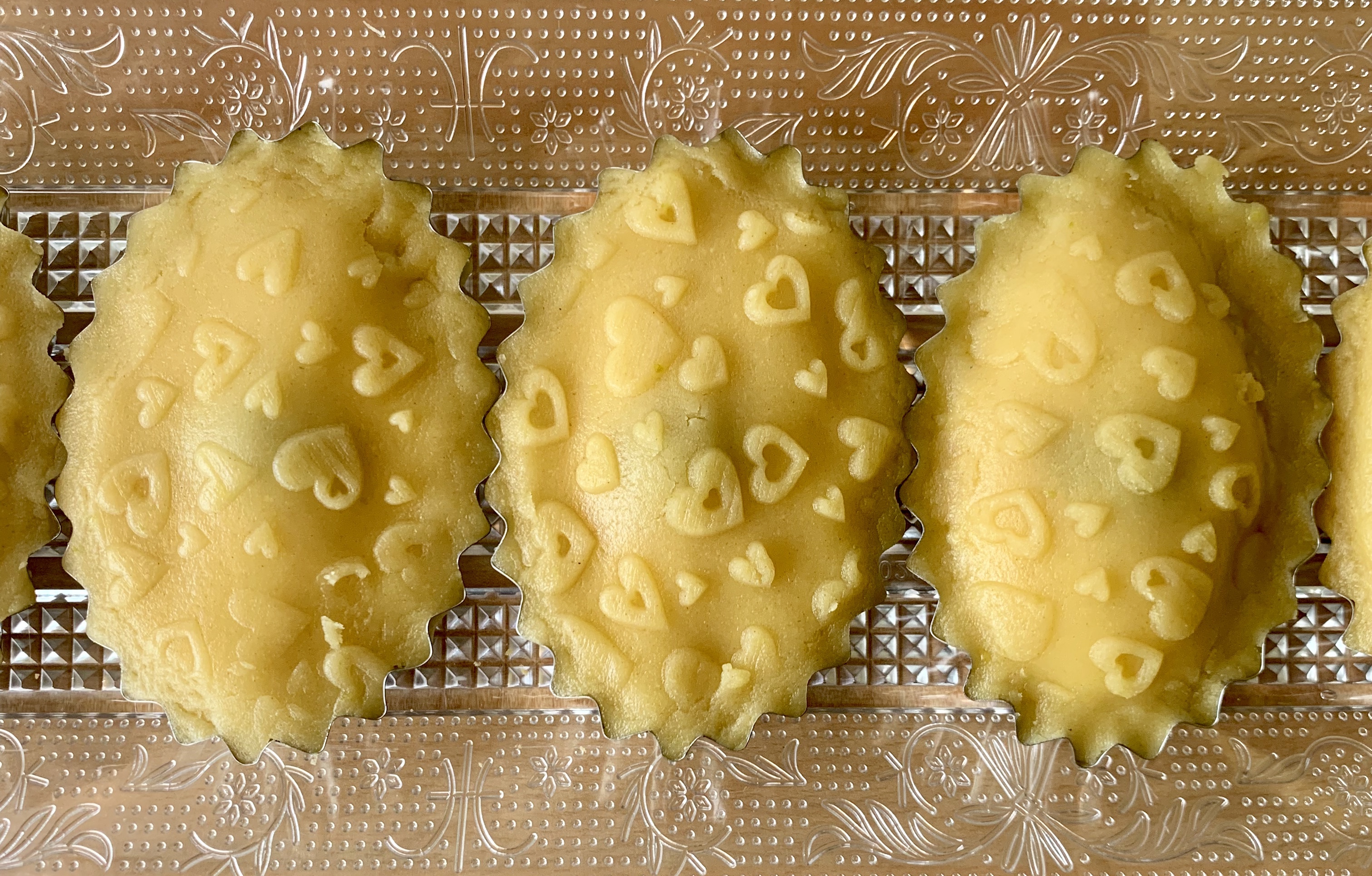 Inoltre ho voluto dargli un design differente nel guscio, usando un mattarello decorativo con i cuoricini, e mi sono divertito per un paio di Pasticciotti a sostituire la copertura in frolla con fiocchi di cocco e un’altro con briciole di frolla tipo crumble.
