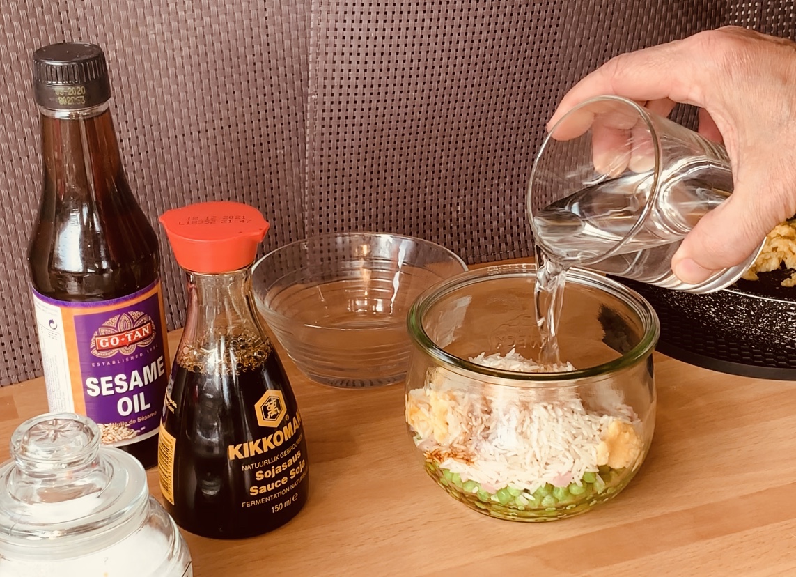 In ogni vasetto unire al cipollotto rosolato, 60 g di piselli, 33 g di prosciutto a dadini, il dado vegetale e mescolare, poi aggiungere un terzo delle uova strapazzate, 50 g di riso basmati, un cucchiaio di salsa di soia, pizzico di sale e 110 ml di acqua.