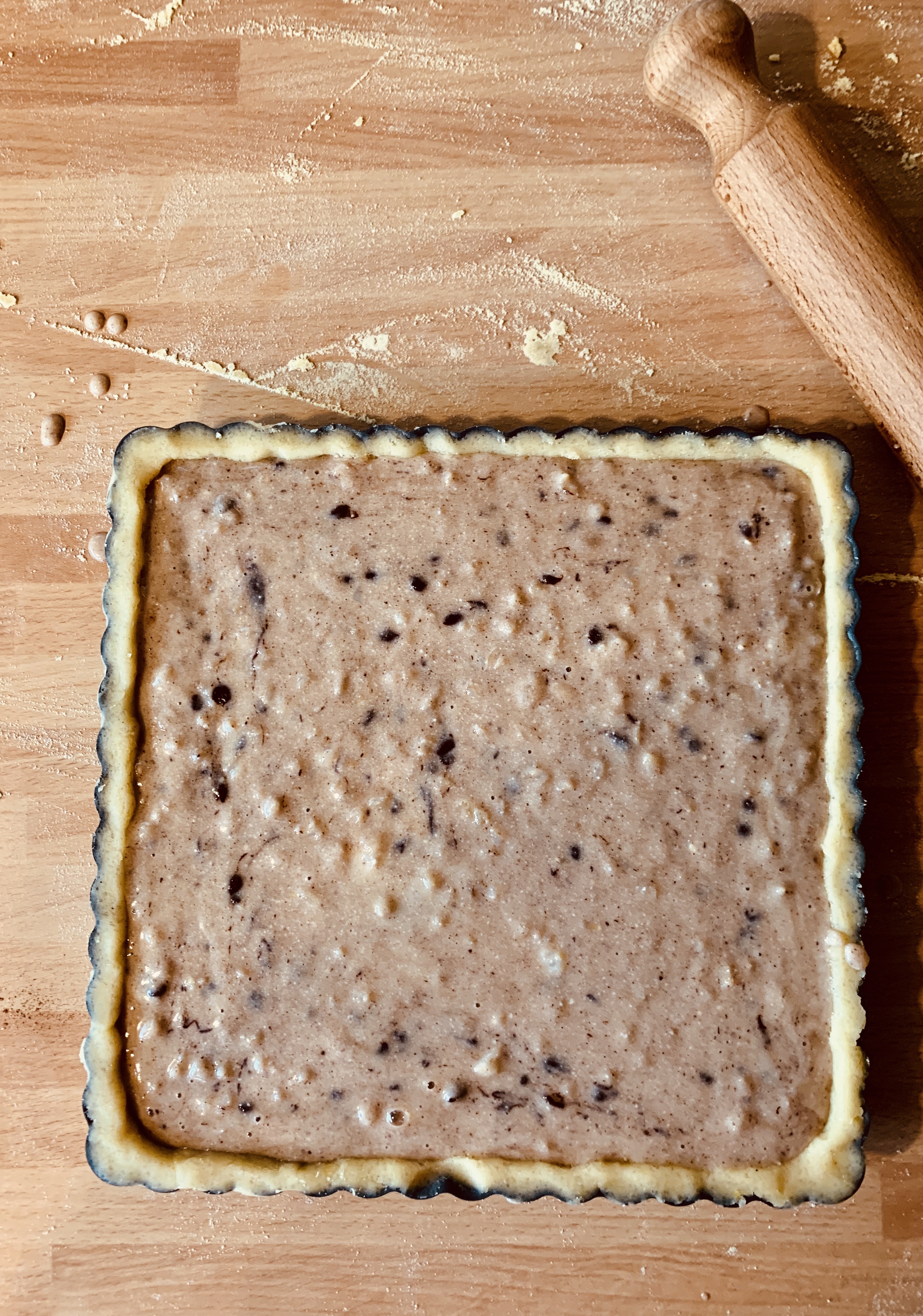Imburrare e infarinare una tortiera quadrata, nel mio caso, ma può essere anche rotonda da 24/26 cm e foderarla e bucarla con una forchetta il fondo e metterla in frigorifero per 30 minuti.