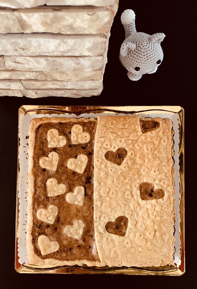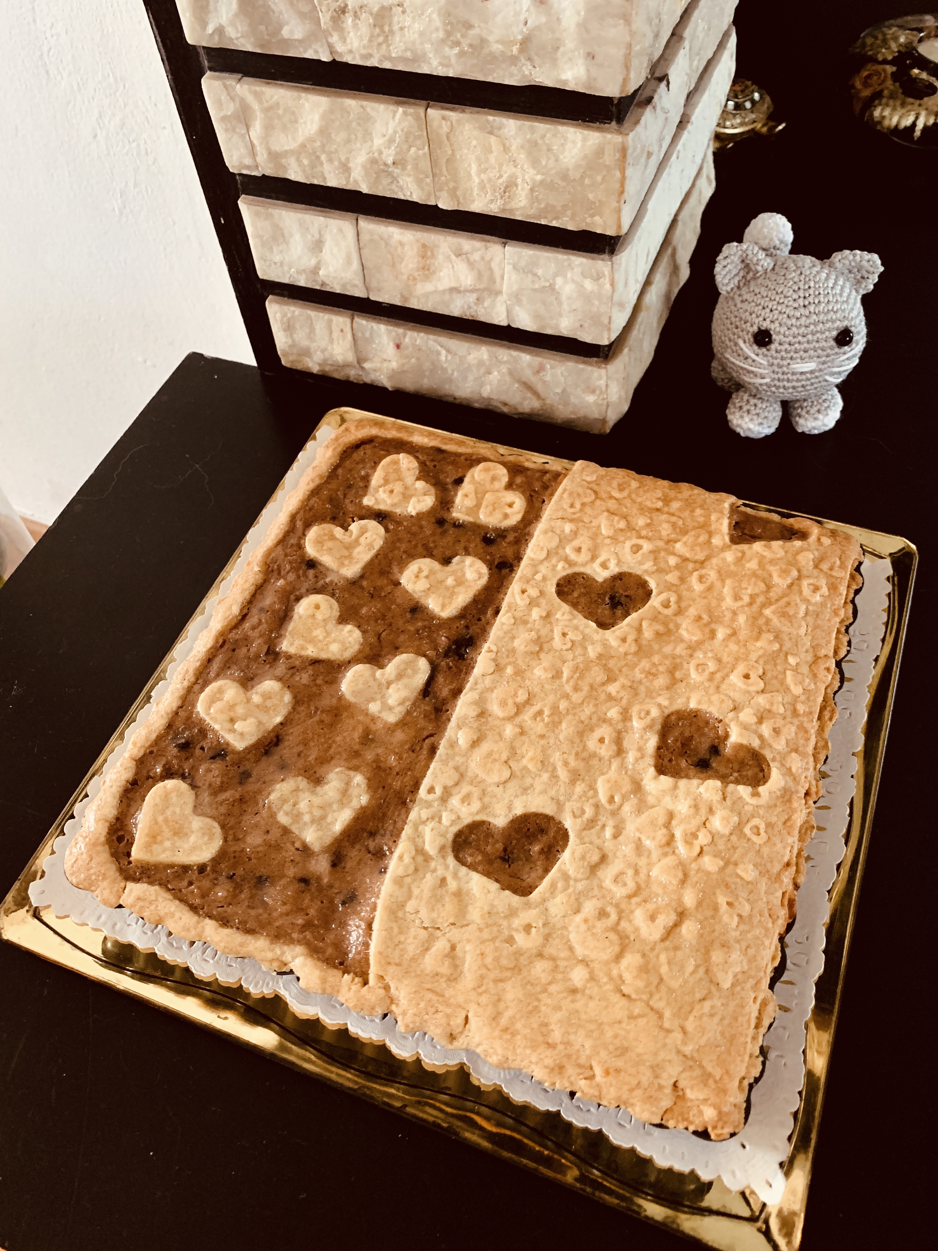 Adagiare la striscia su una metà della tortane sull’altra metà distribuire i cuoricini tagliati.