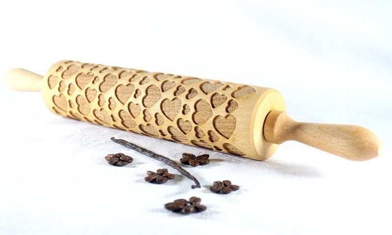 Stendere la pasta frolla restante dello spessore di circa 5 mm e tagliarne una striscia che copra la metà della tortiera e con passargli sopra con un mattarello decorativo leggermente infarinato, il mio e di cuoricini, poi con uno stampo a forma di cuore tagliare dei cuoricini.