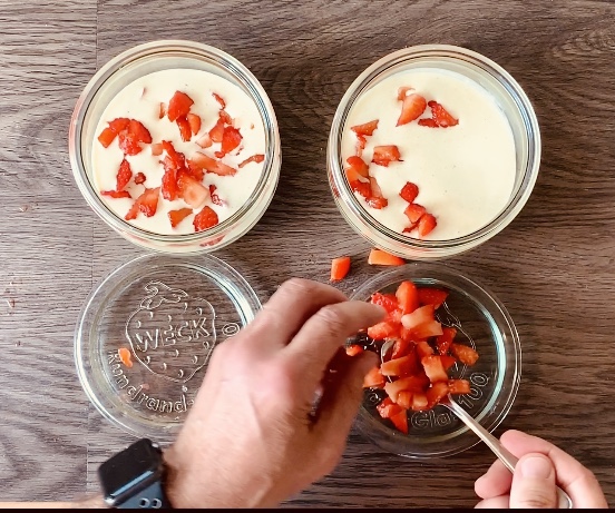 Dividere il composto in due vasetti da 350 ml e adagiate sopra le fragole tagliate a cubetti.