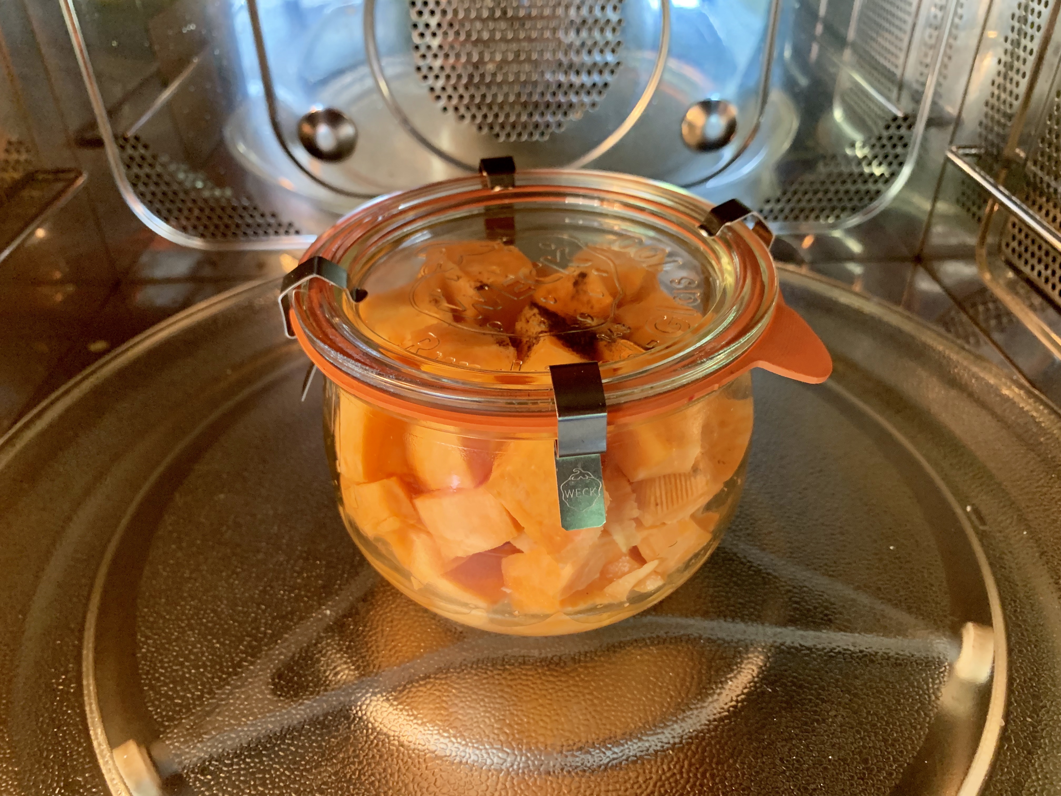 Cotta in vasetto la patata dolce, in soli sei minuti, è pronta per essere arricchita con frutta secca, cacao e pochissimo zucchero o dolcificante.
