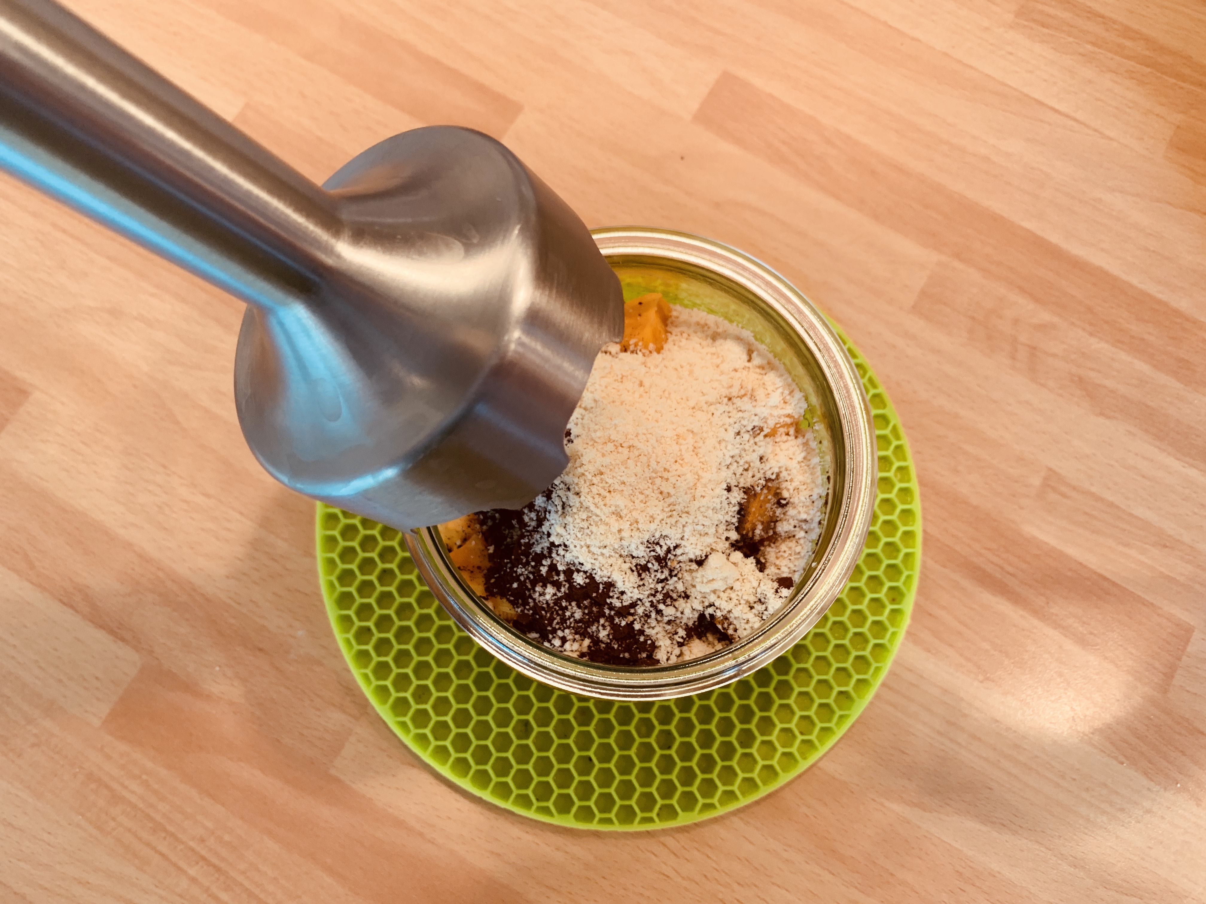 Sganciare i gancetti e rimettere in microonde il vasetto per 2/3 minuti, tirare la linguetta della guarnizione, togliere il tappo e aggiungere lo zucchero di cocco o il miele, il cacao e la polvere di mandorle, con un frullatore a immersione, minipimer frullare il contenuto fino a formare una crema omogenea.