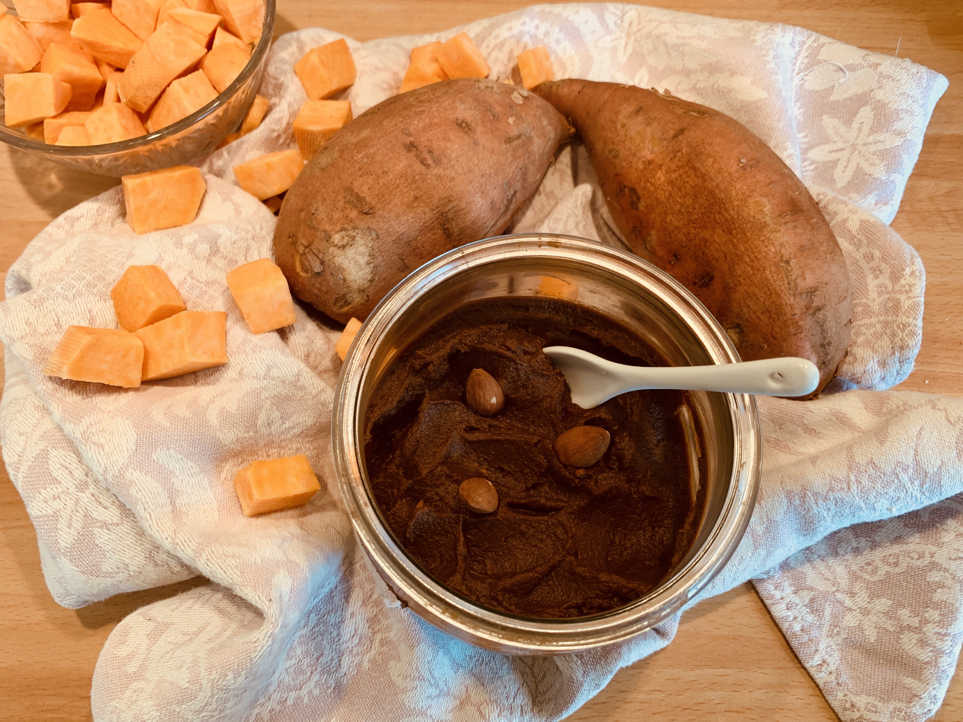 A very fast and very enveloping dessert, made with very few ingredients, sweet potato, coconut sugar, honey or sweetener, cocoa, almonds and vanilla.