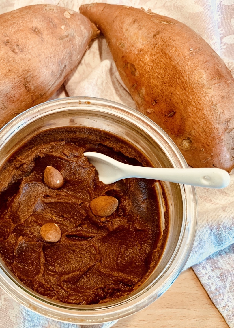 Un dolce velocissimo e davvero avvolgente, fatto con pochissimi ingredienti, patata dolce, zucchero di cocco, miele o dolcificante, cacao, mandorle e vaniglia.