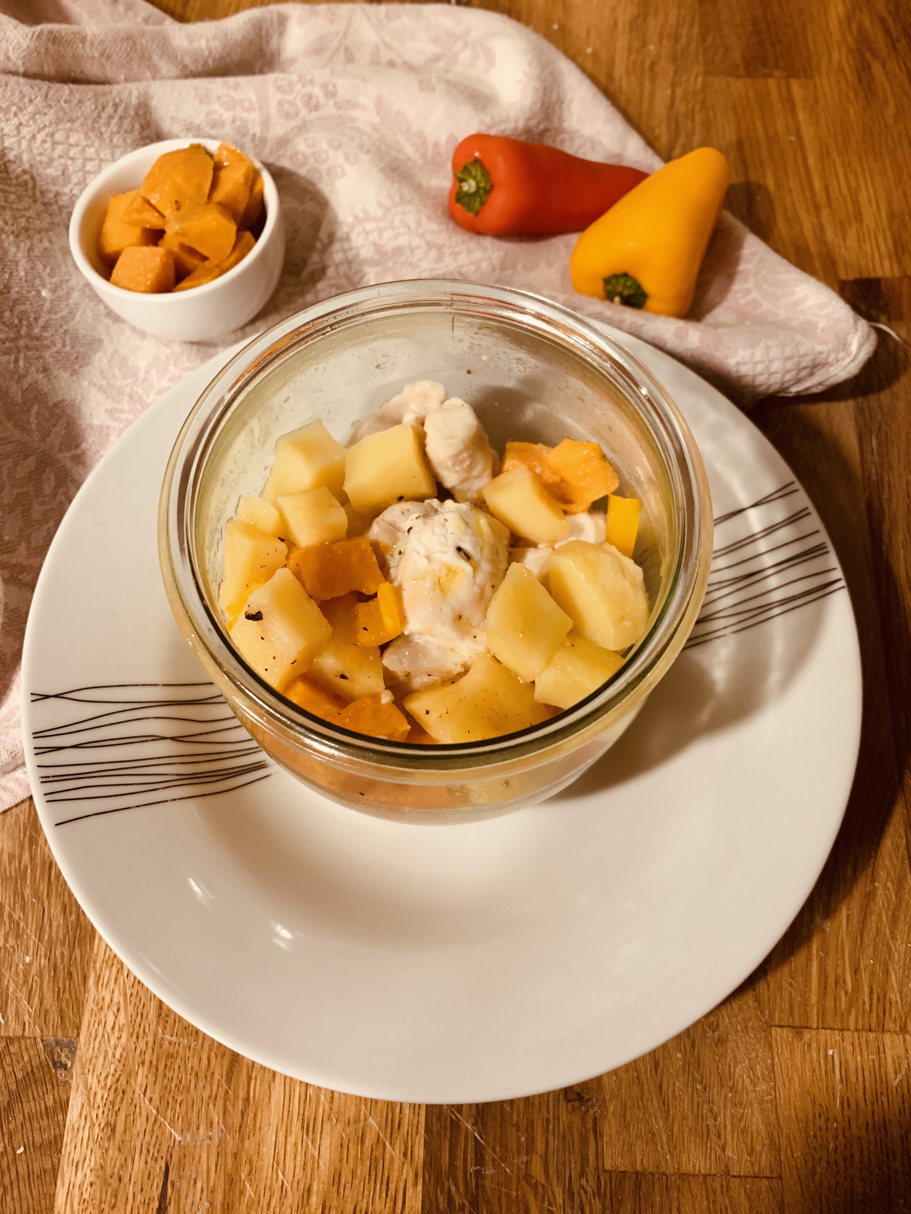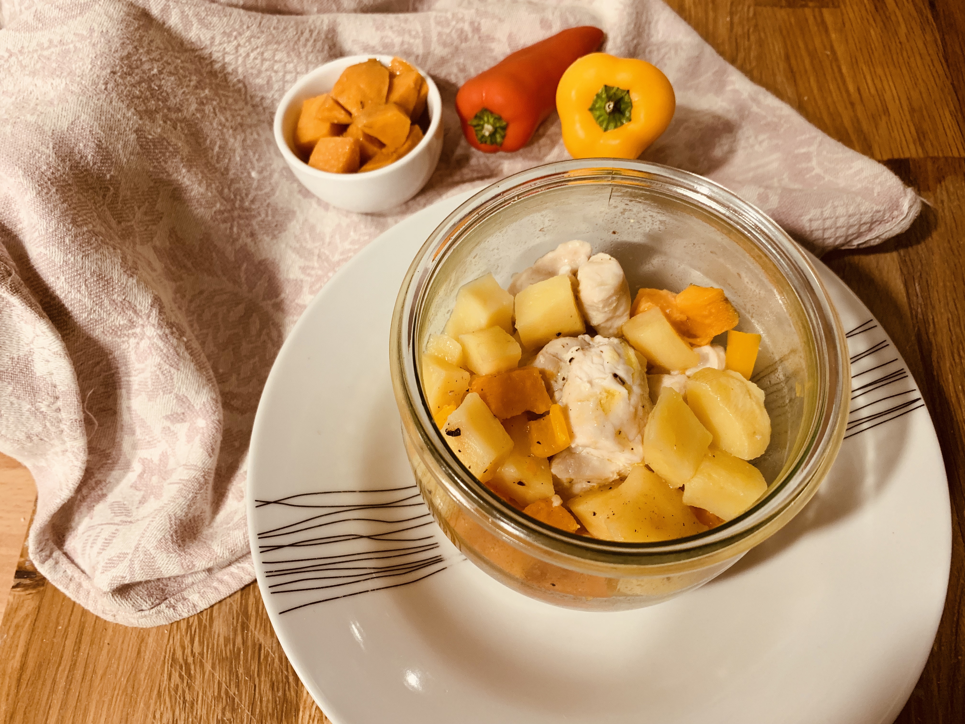 Pollo e patate in Vasocottura al microonde, cotto nel vasetto in soli 6 minuti e preparato con ingredienti molto semplici che abbiamo sempre in casa, aglio, olio evo, pollo, peperoni, patate e rosmarino, un goccio di vino bianco e la ricetta del pollo e patate in vasocottura è pronta.