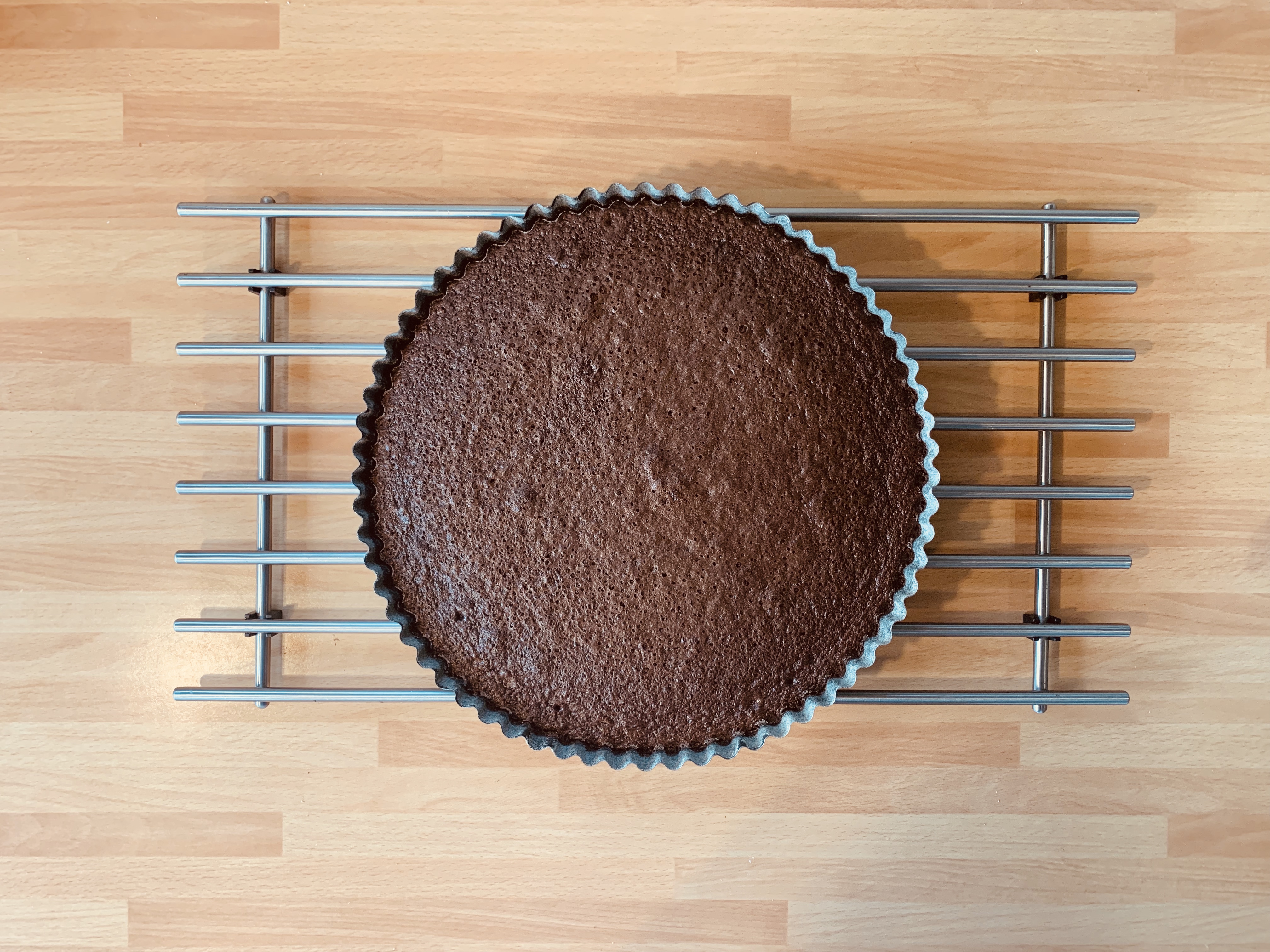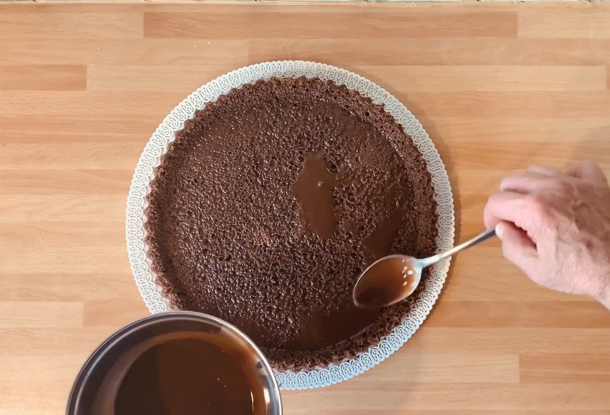 Quando il pan di spagna al cioccolato è raffreddato, smodellarlo dalla forma, inzupparlo abbondantemente con lo sciroppo al cacao,