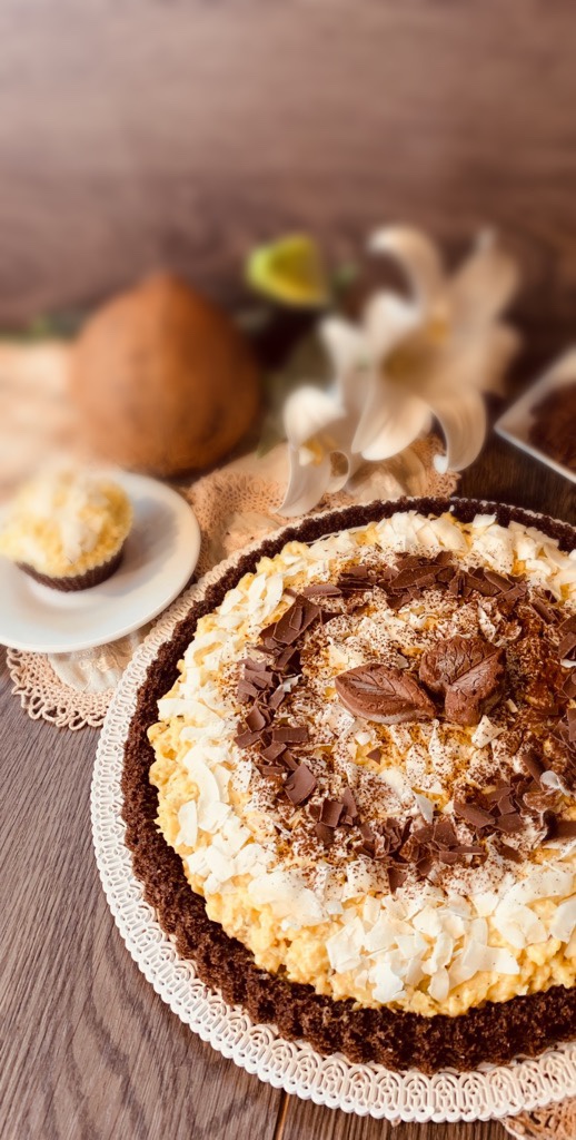 Decorate it to your liking, I covered the surface with dehydrated coconut flakes, a sprinkling of cocoa and a few chocolate chips, but you can also use only freshly grated coconut.