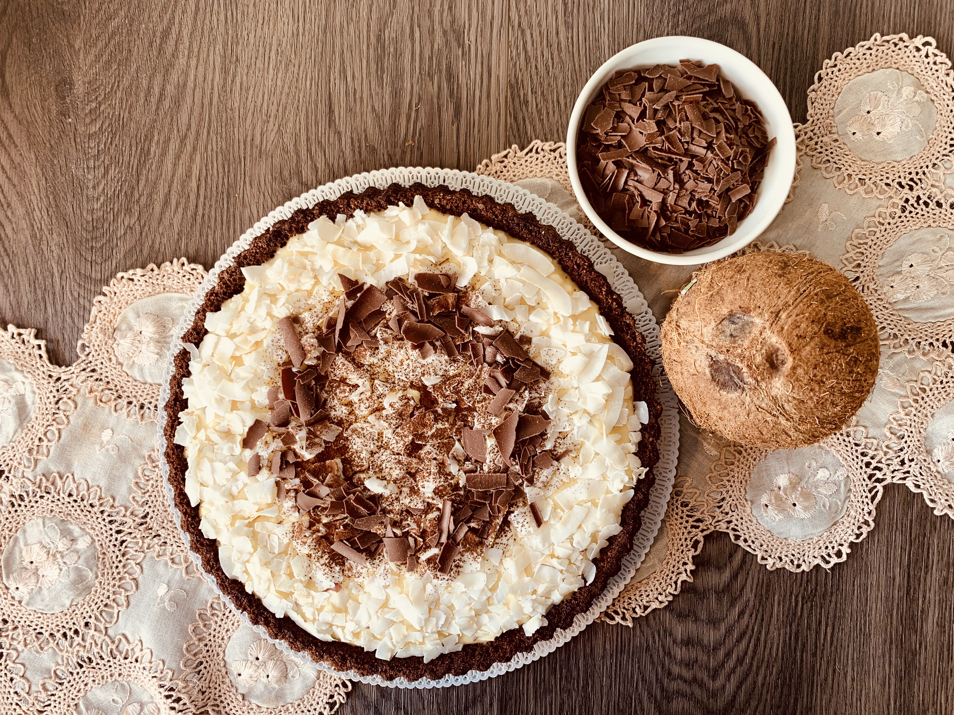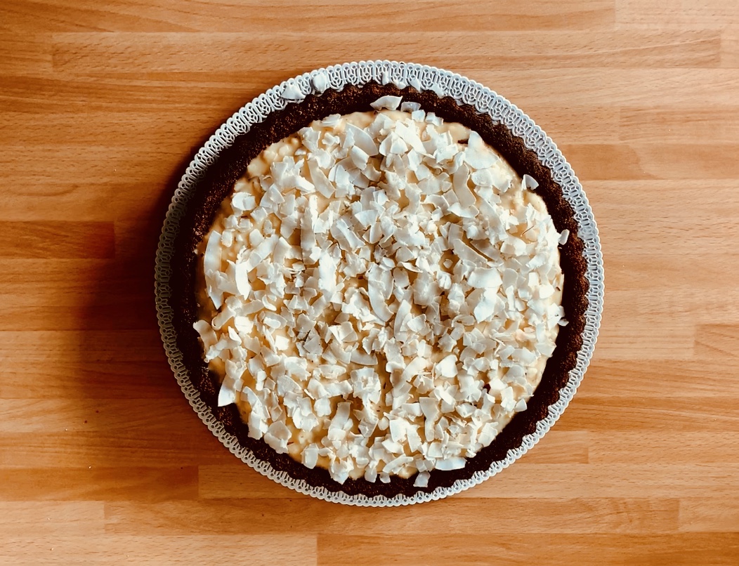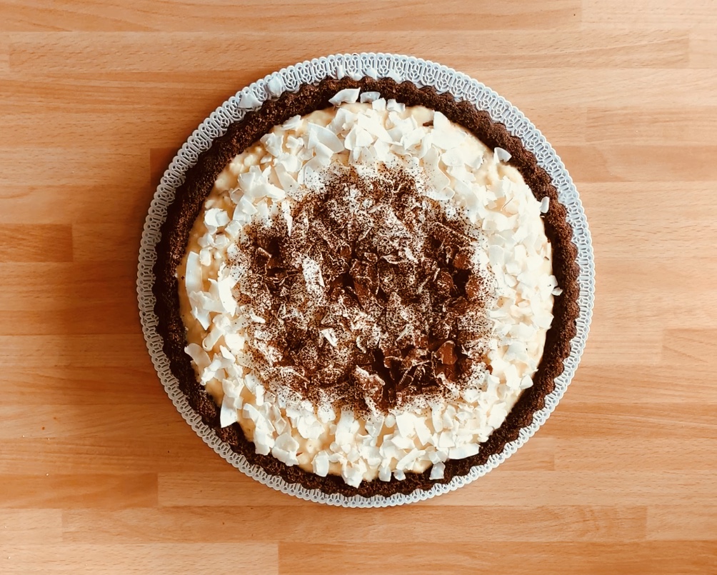 Decorarlo a piacere, io ho coperto la superficie con fiocchi di cocco disidratato, una spolverata di cacao e qualche scaglia di cioccolato, ma puoi usare anche solo del cocco fresco grattugiato.