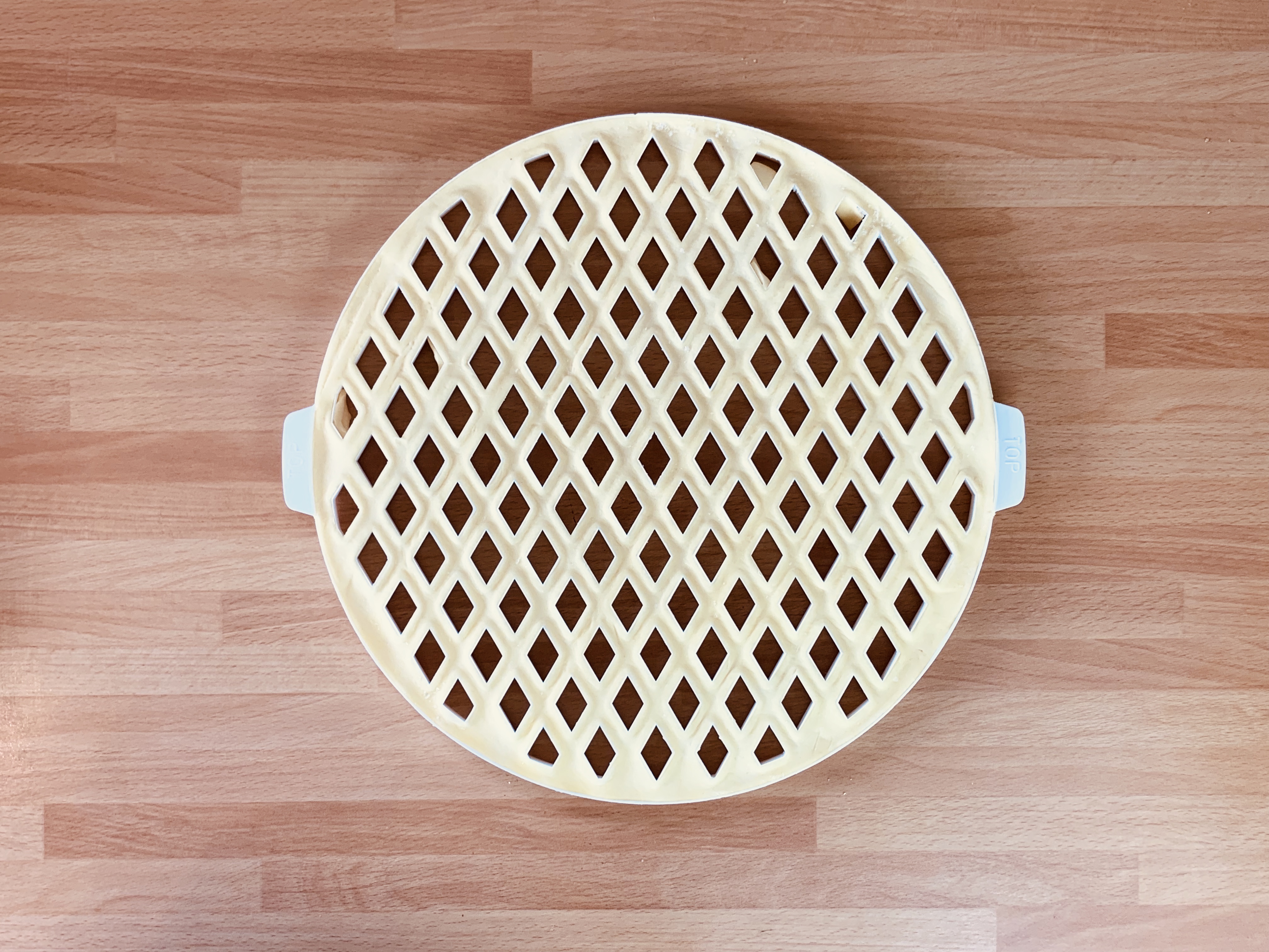 Per la seconda versione della Melamangio, ho usato della pasta brisè, l’ho stesa sullo stampo a griglia e messo in congelatore un giorno per l’altro; poi l’ho messa sul fondo di una forma da crostata è ho versato l’altra metà dell’impasto.
