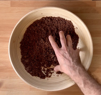Aggiungere l’olio di cocco e mescolare con la punta delle dita fino ad ottenere una miscela densa, umida e omogenea.
