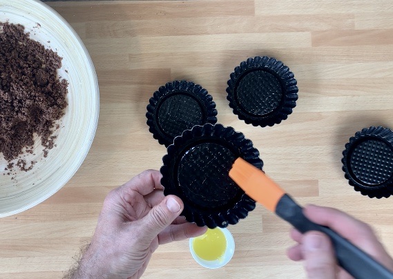 Versare la ganache nei gusci delle crostatine cotte e raffreddate a temperatura ambiente e mettere in frigo per 30 minuti.