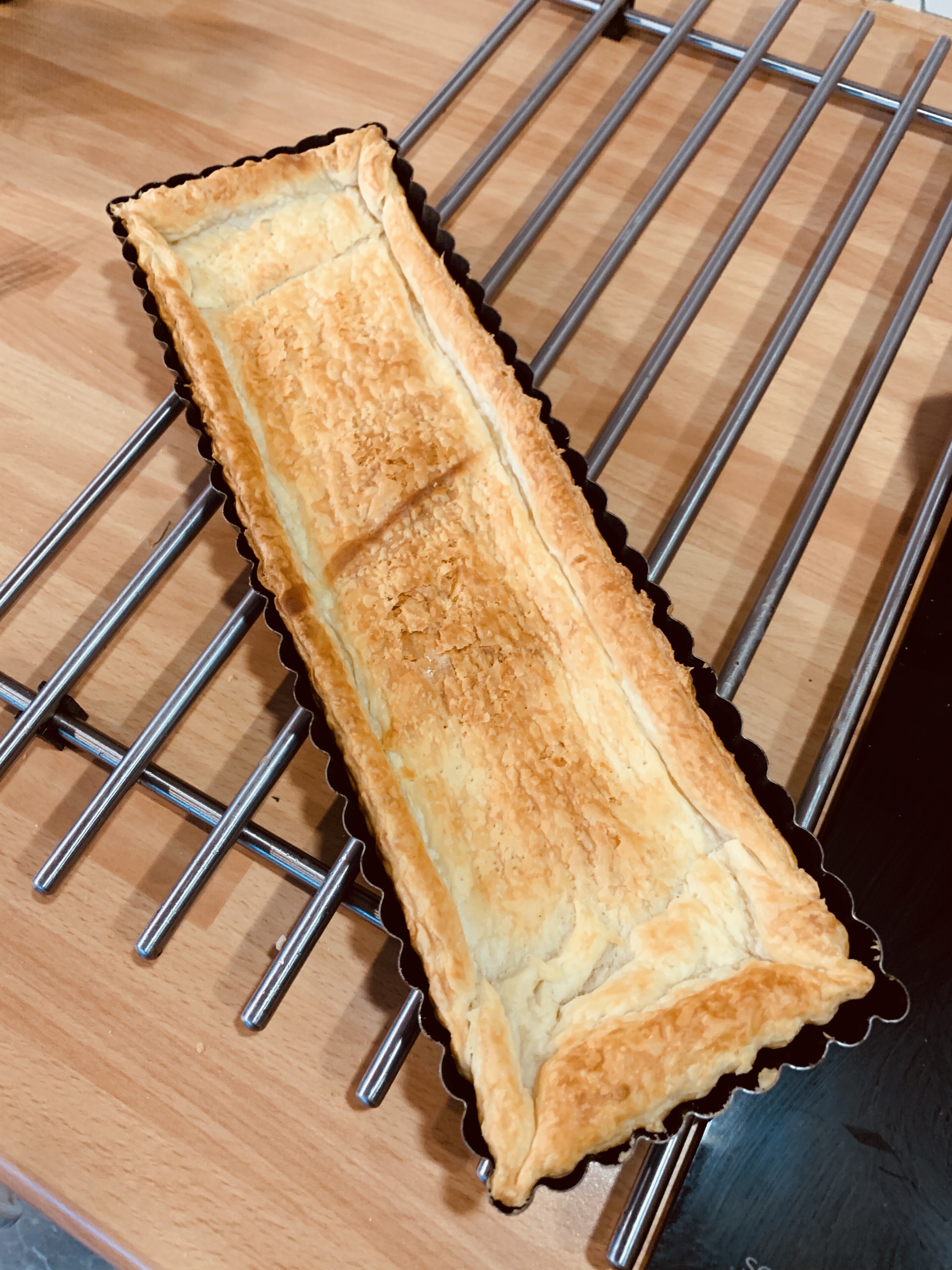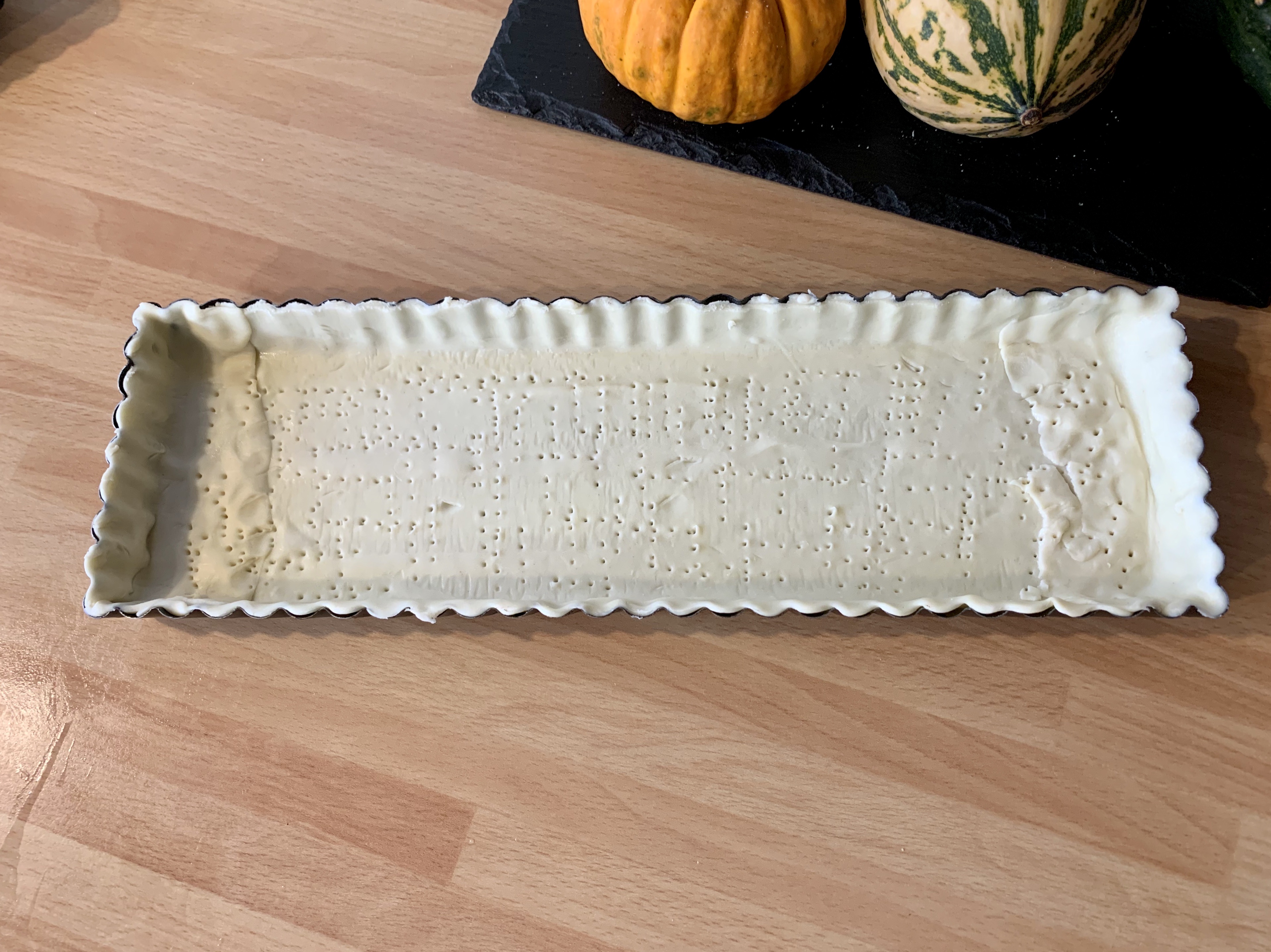 Per prima cosa stendiamo la pasta sfoglia nella forma rettangolare con fondo rimovibile, buchiamo il fondo con la forchetta e cuociamo in forno preriscaldato a 180 gradi per 20 minuti.
