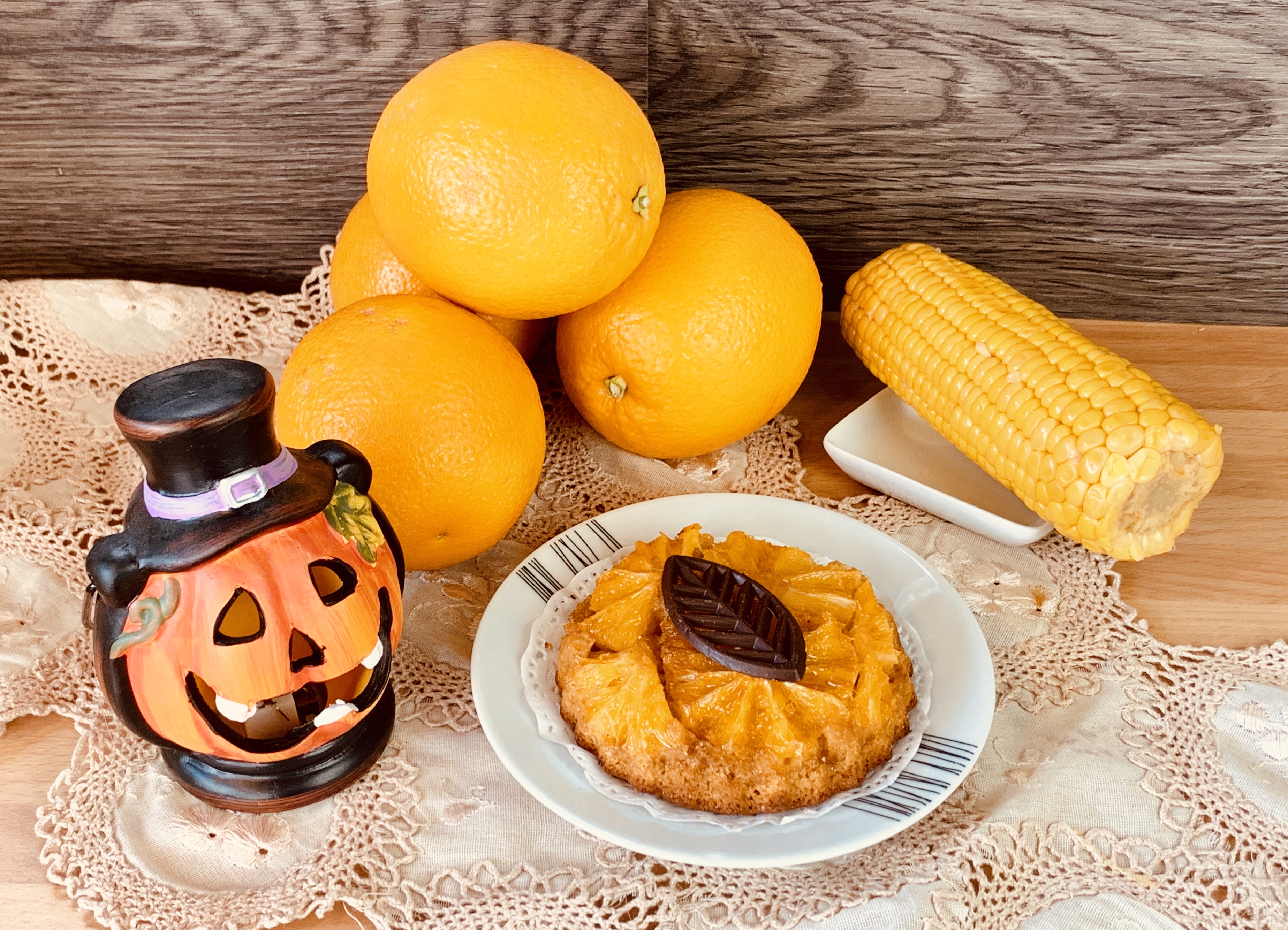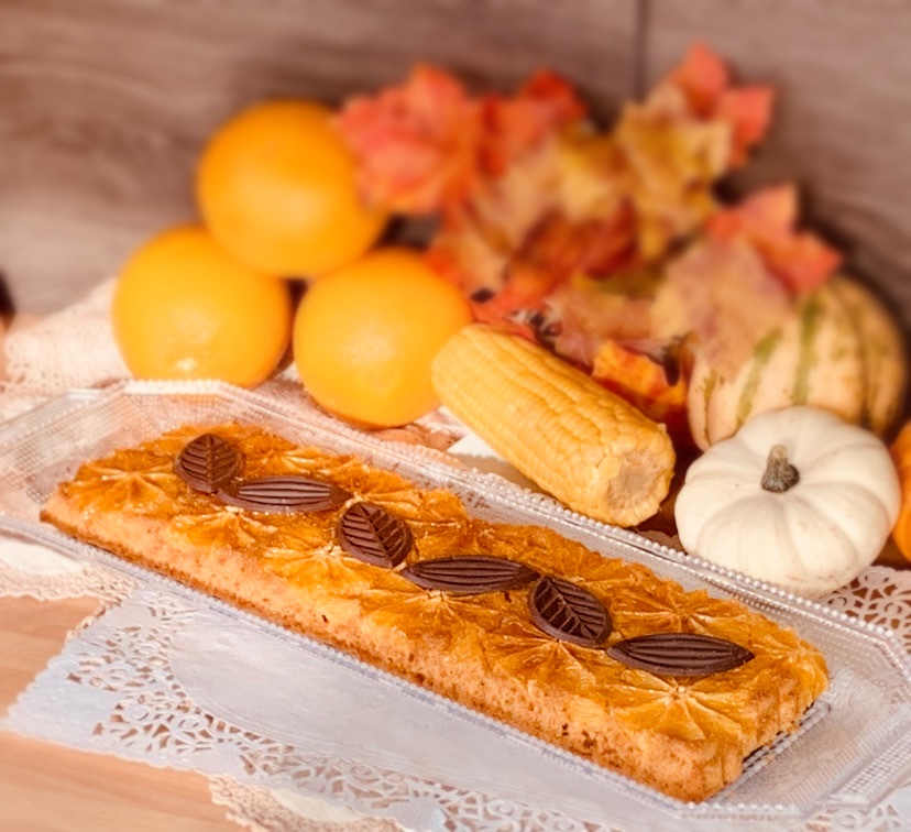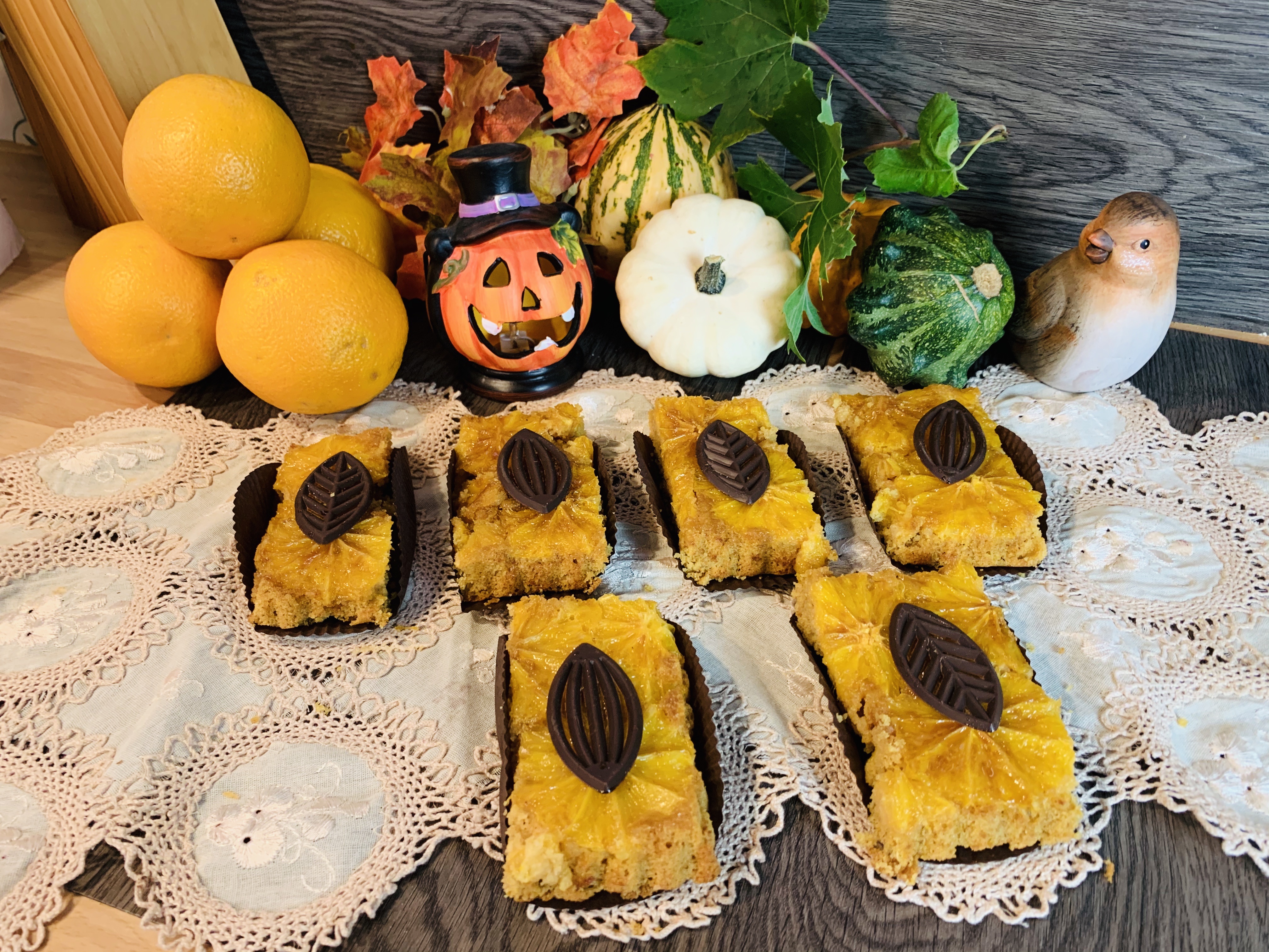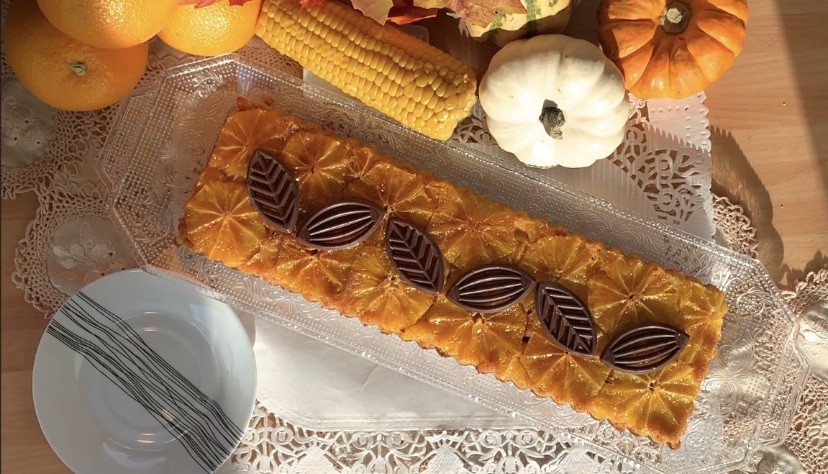 Put it back in the oven for about 1 minute, only to melt the caramel powder and let it shine and lightly color the cake. Finally I decorated the Orange Cake with chocolate leaves.