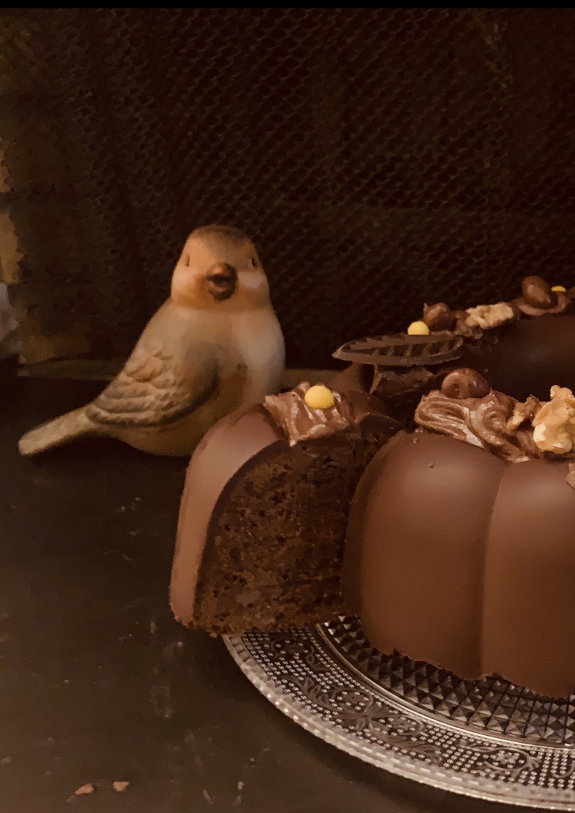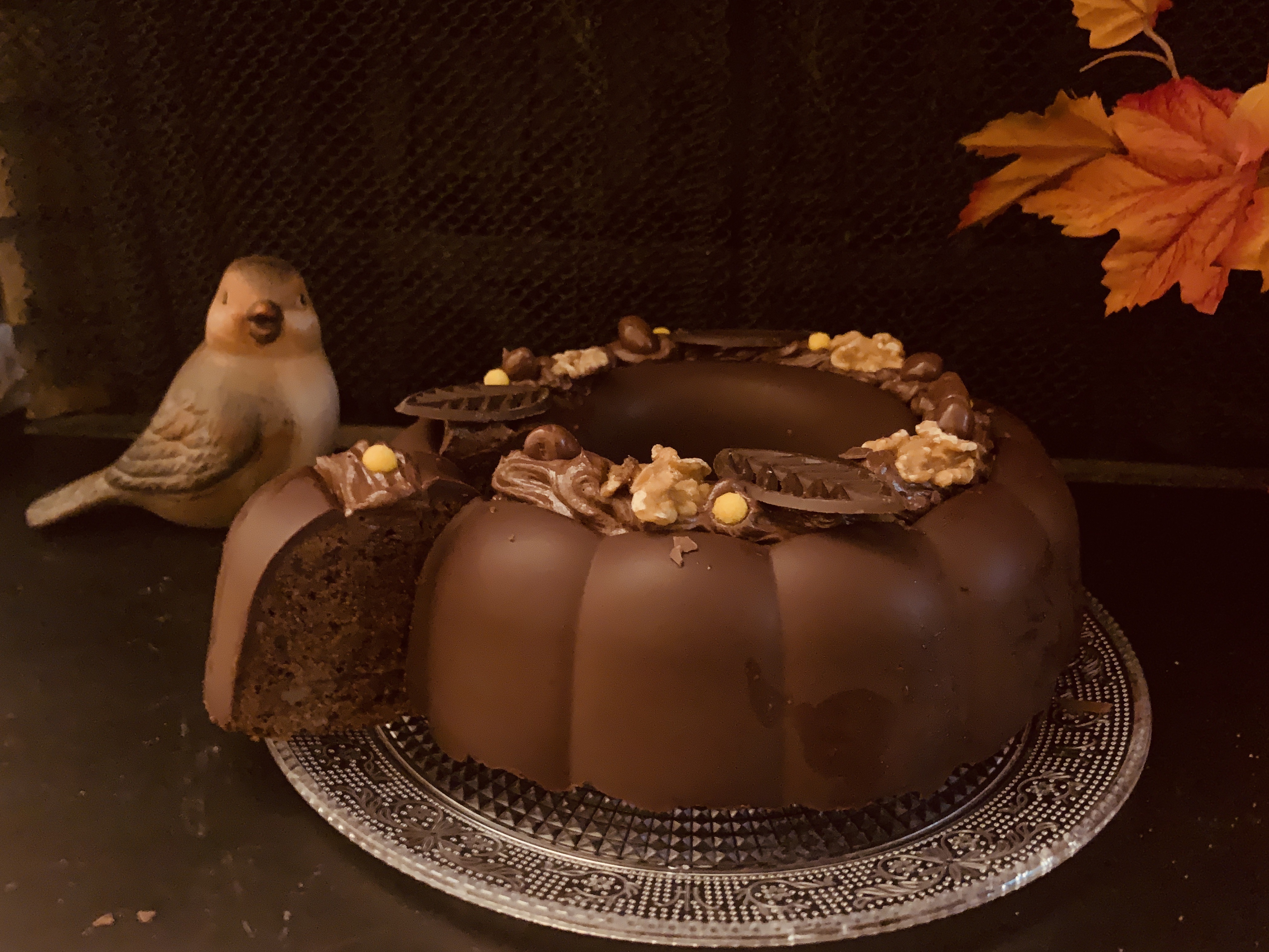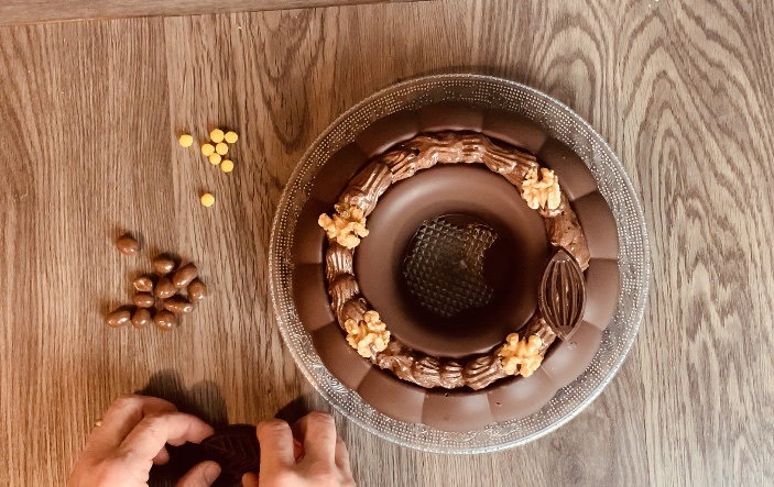 Decorarlo a piacere, io ho farcito l’incavo con della crema al burro e cacao e decorato con noci, mimosa candita e cioccolatini