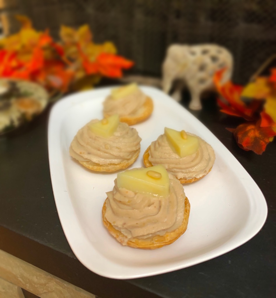 Le sfogliatine alla crema di castagne e mascarpone con scamorza a alla piastra è un gustoso mise en bouche per un aperitivo autunnale, una sorta di montblanc dolce salato dove le consistenza della pasta sfoglia, il dolce della crema di castagna e mascarpone e il salato della provola grigliata e il pinolo tostato creano un tuttuno delizioso al palato.