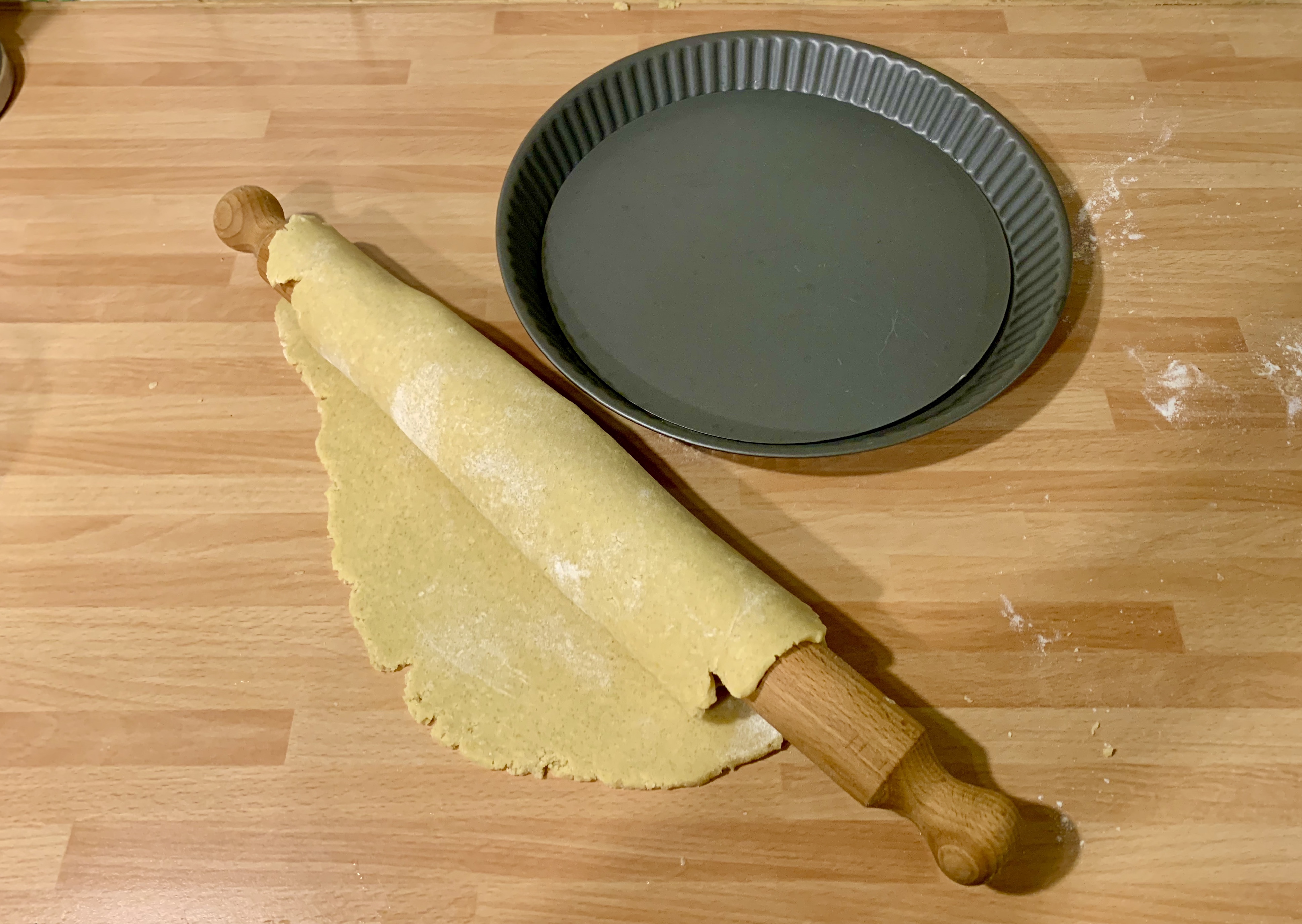 Riprendere l’impasto della frolla, stenderla ad uno spessore di 5 mm e foderare una forma per crostata, bucherellate il fondo con una forchetta,