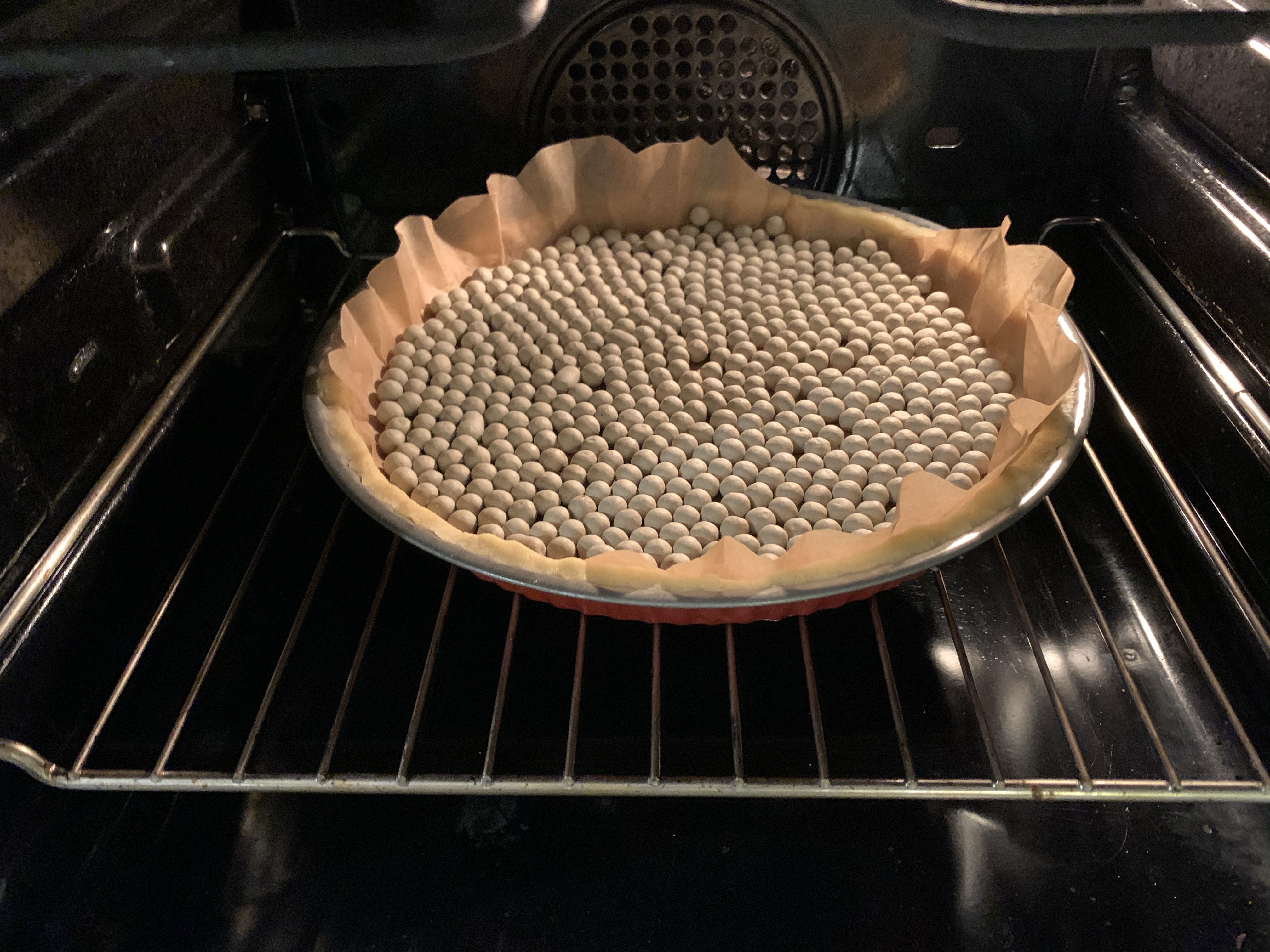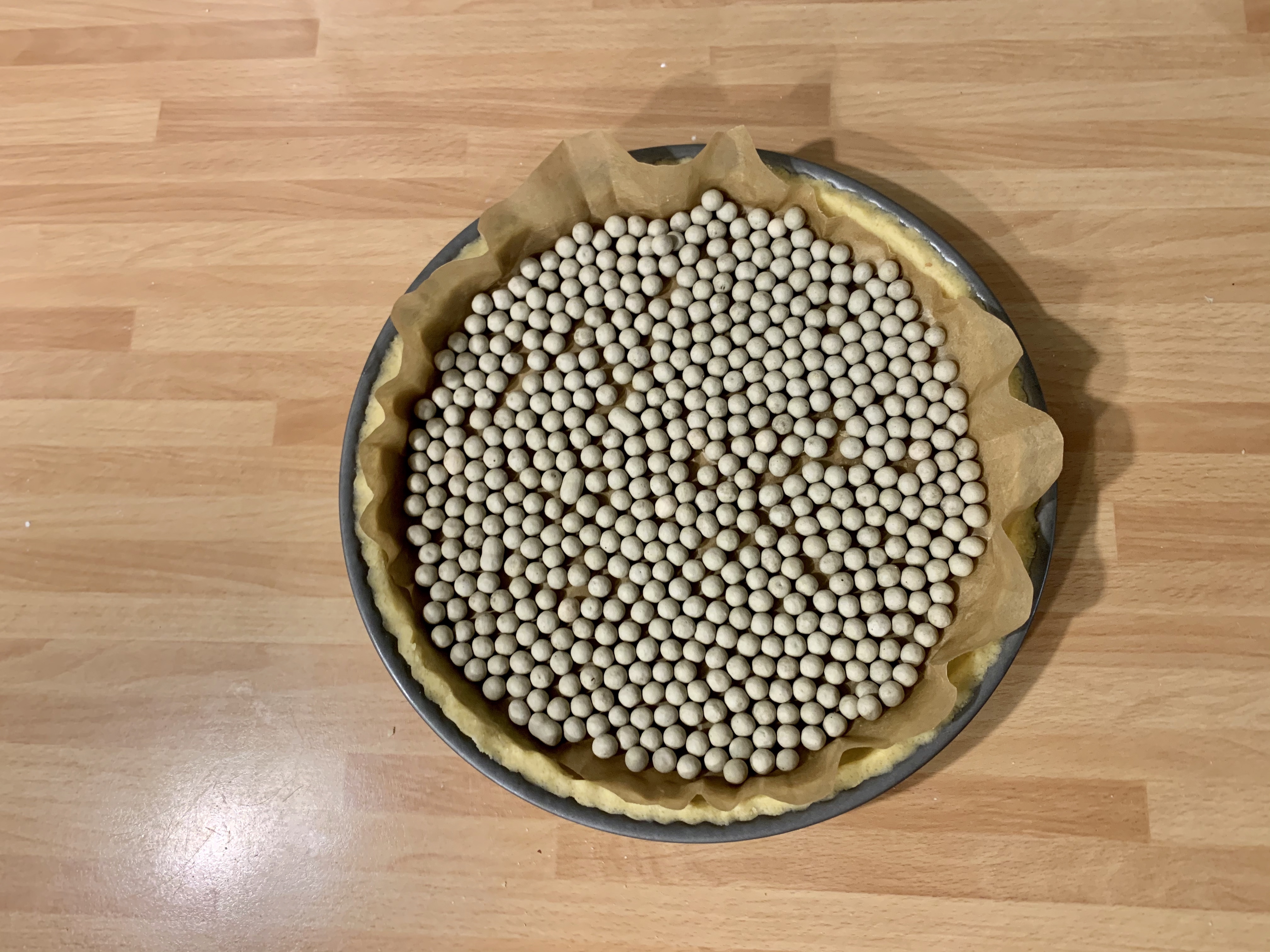 Coprirla con della carta forno e poi le perle di ceramica per la cottura in bianco