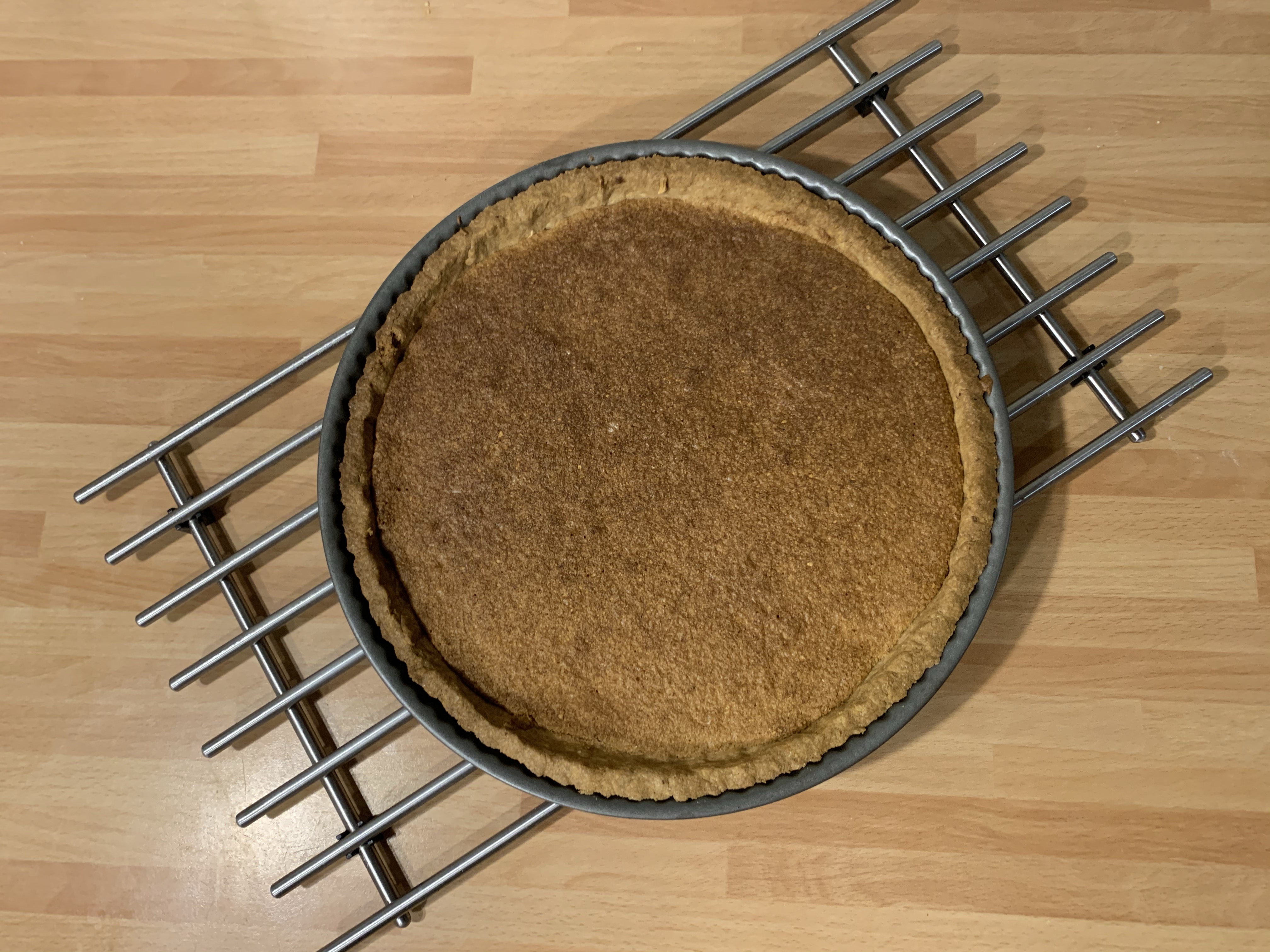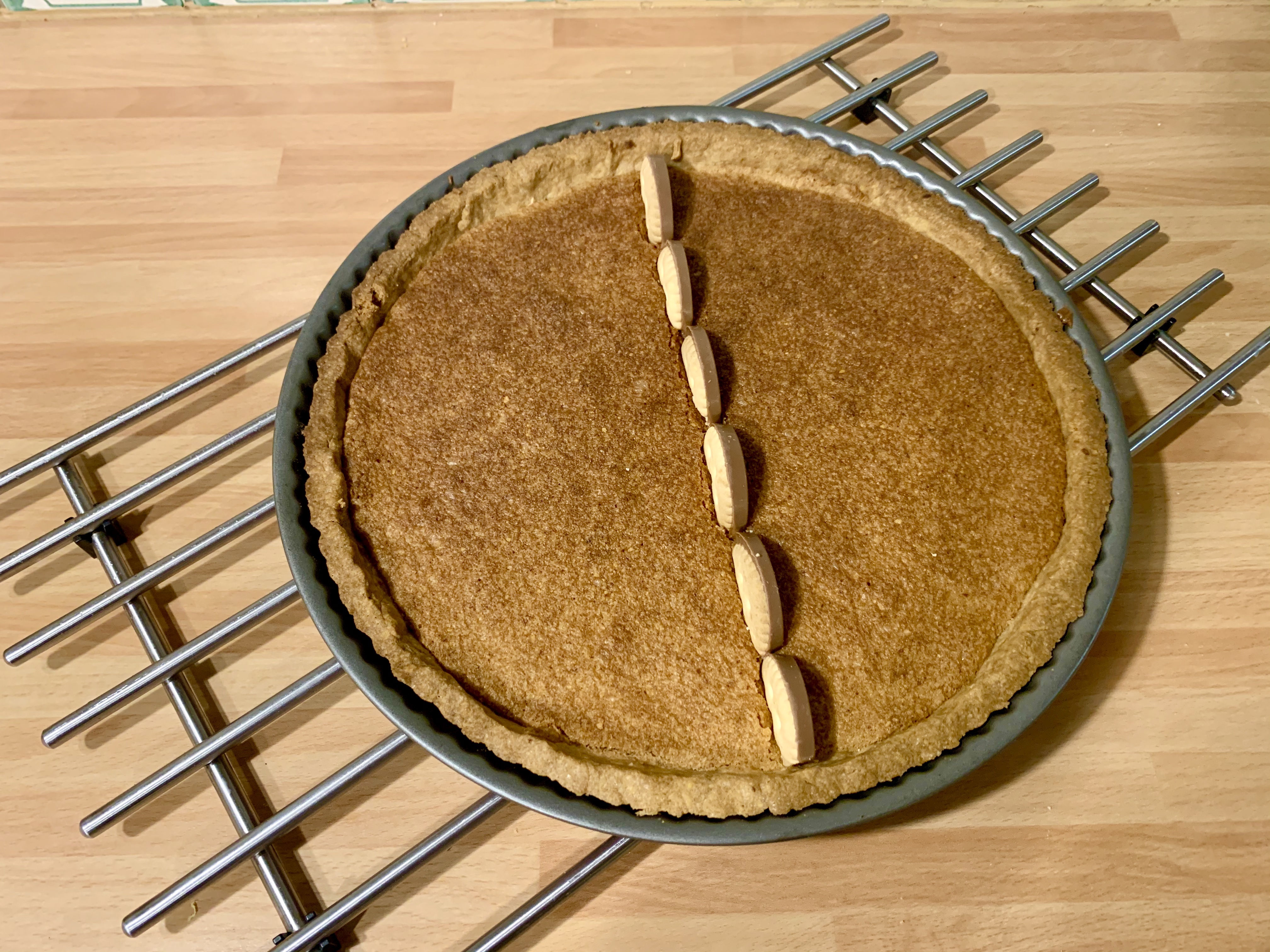 Lasciar raffreddare leggermente la crema prima di versarla su una metà della crostata al frangipane, metà che ho creato incastrando nel mezzo una fila di biscotti per metà ricoperti al cioccolato senza glutine