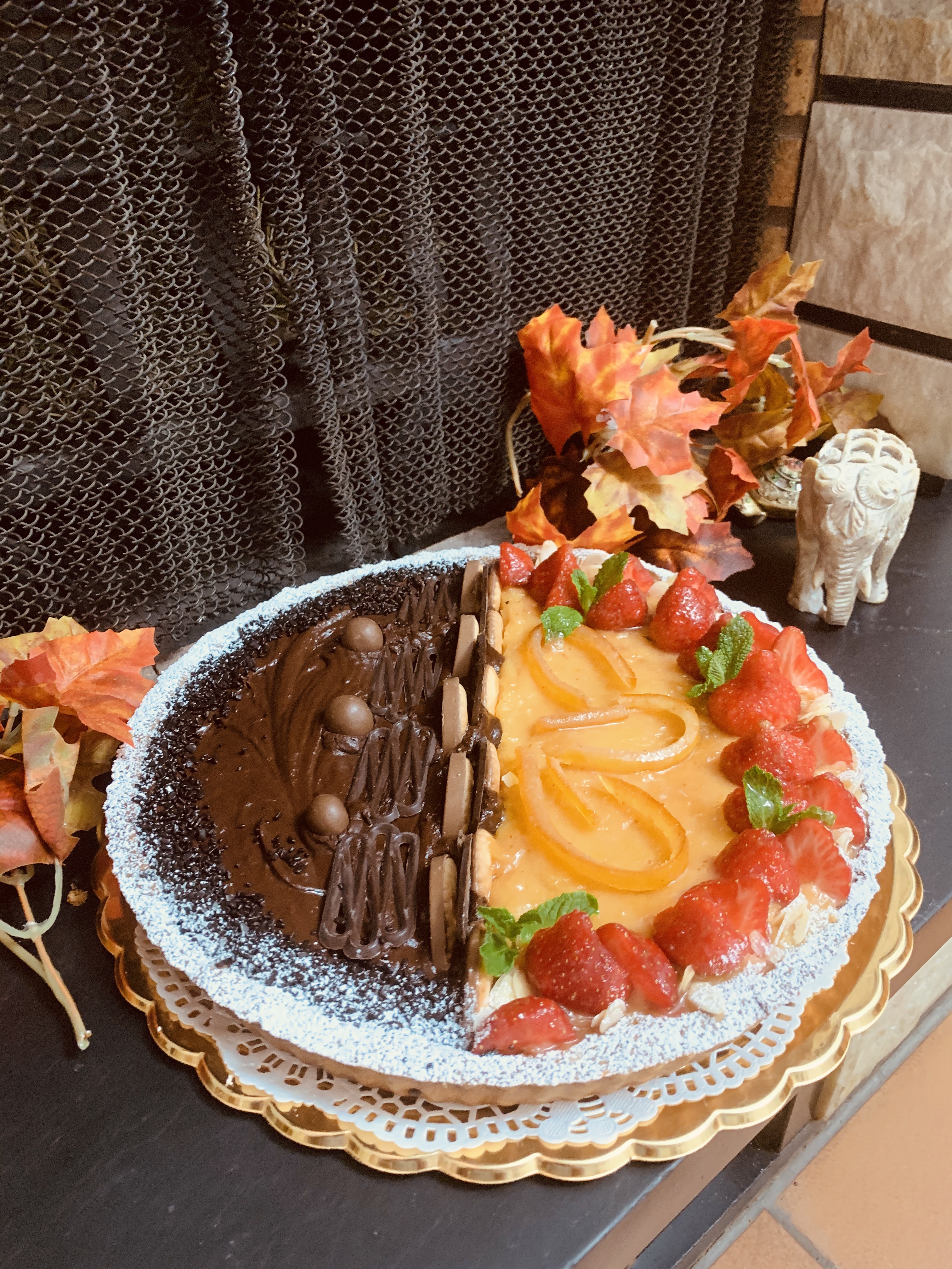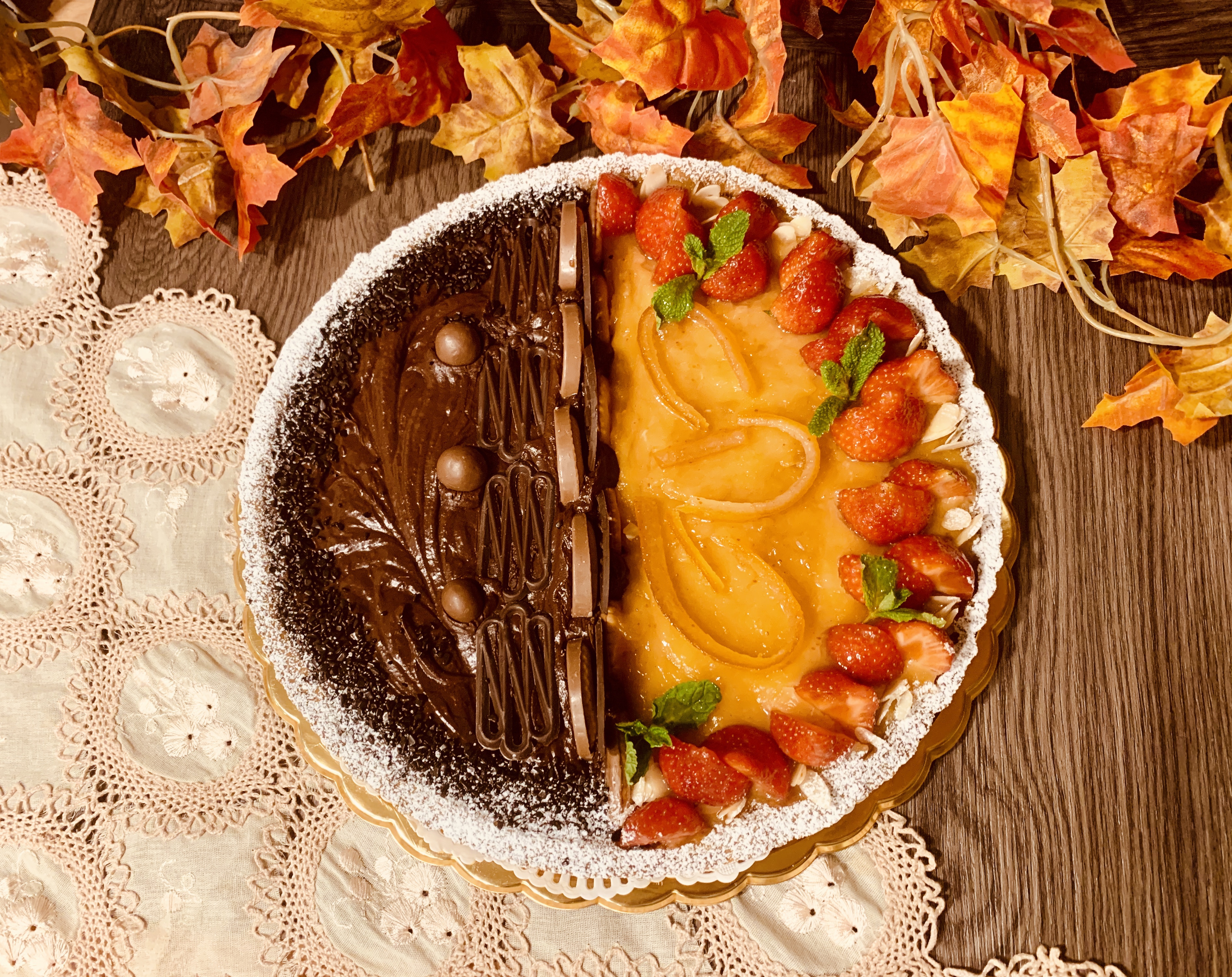 In occasione del compleanno dei figli gemelli di una mia amica ho confezionato questa ricetta gluten free per essere assaporata da tutti, incluso loro che hanno l’intolleranza al glutine, il bello che ad uno dei due piace la crema di limone e all’altro la crema al cioccolato, ho accontentato entrambi creando questa Crostata Yin e Yang si compone di pasta frolla e la crema frangipane alle mandorle che ho chiamato Yin e Yang, perché l’ho completata per metà con crema di limone e l’altra metà con una ganache di cioccolato.