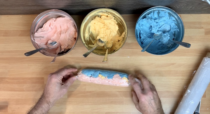 Stendere della pellicola sul bancone e con un cucchiaino allineare le 3 creme colorate, uno accanto all’altra, vedi nella foto, arrotolare creando un salsicciotto,