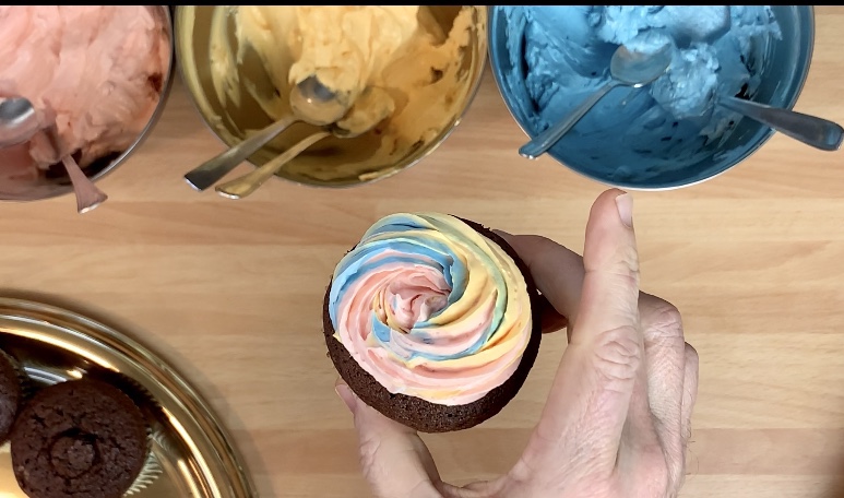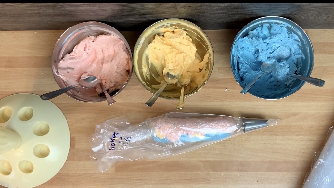 Dividere la Crema al Burro Meringata in 3 ciotole e aggiungere i coloranti azzurro nel primo, rosso nel secondo e giallo nel terzo, aggiungete poco alla volta per raggiungere una colorazione pastello.