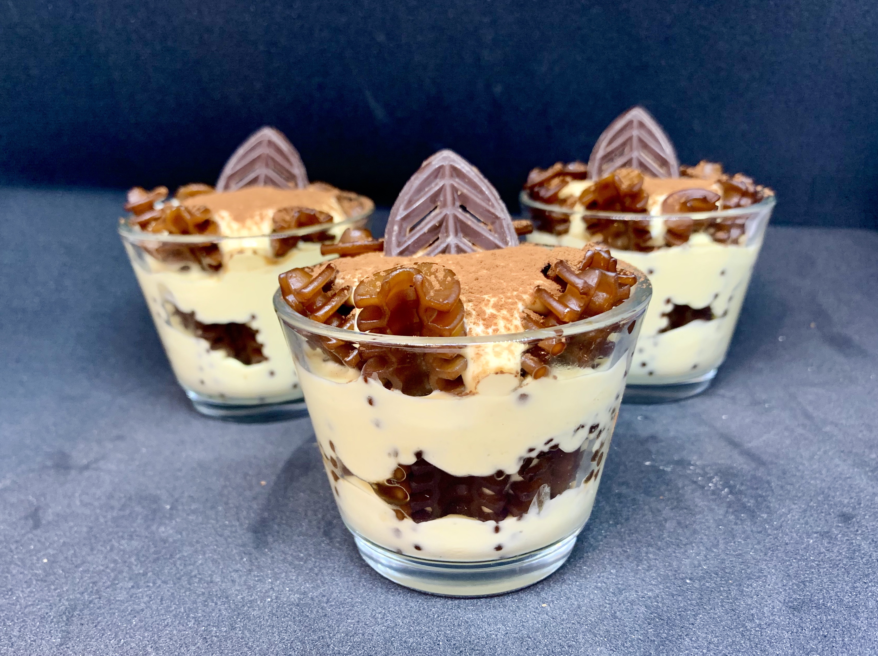 Ancora uno spuntoncino al centro di crema Tiramisù, finalizzare con una spolverata di cacao in polvere e una foglia di cioccolato